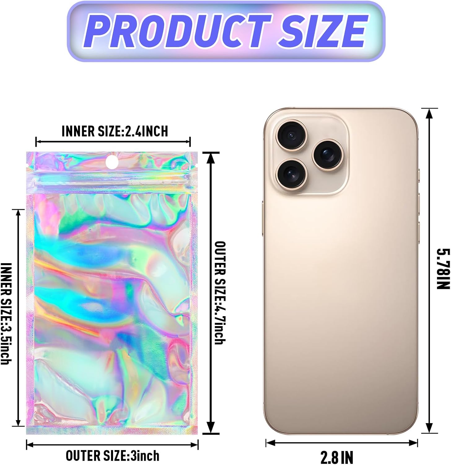 Funfery 100 Pack Smell Proof Holographic Bags Clear Window Resealable Bags,Mylar Foil Bag with Zipper,Sealing Pouch Packaging Bag for Food Storage,Candy,Party Favor Sample Business Supplies(3x4.7in