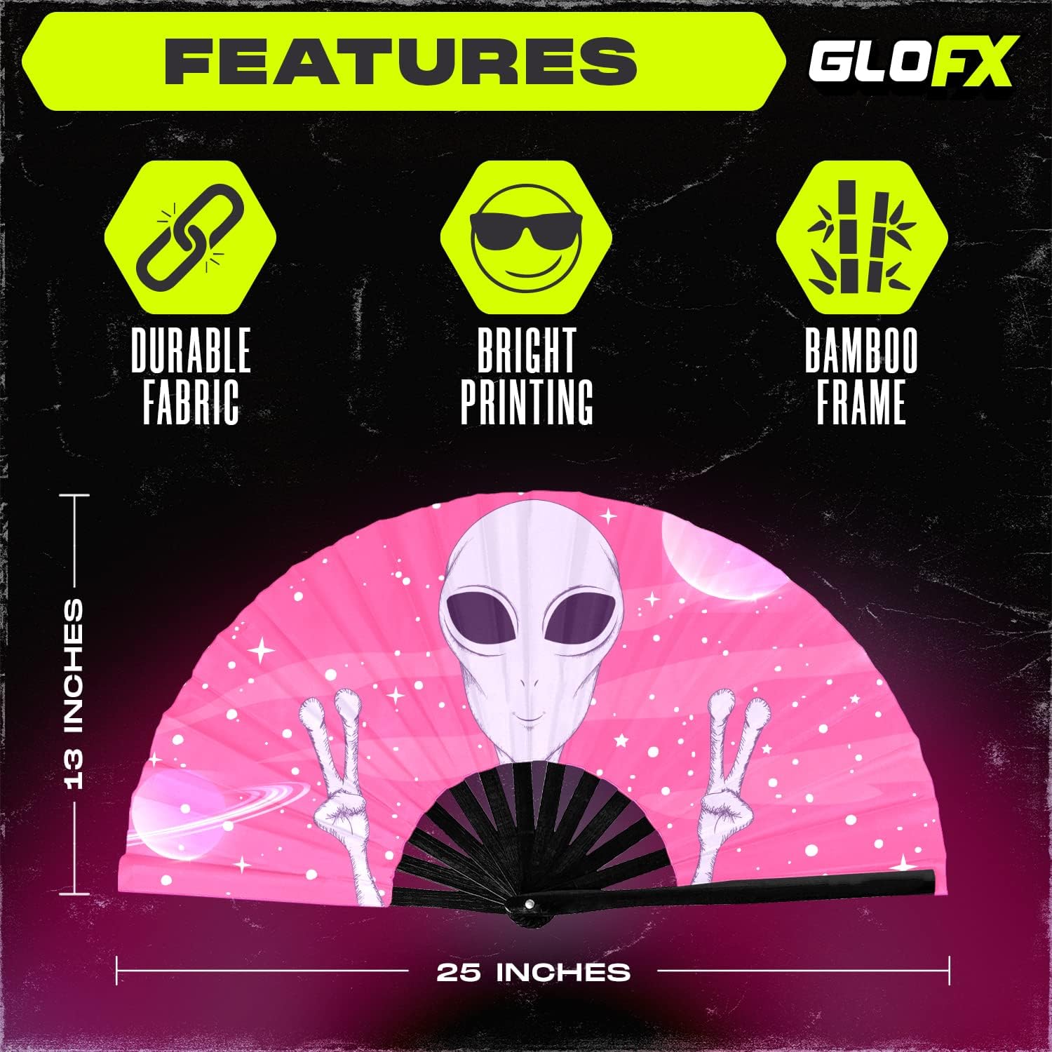 GloFX Rave Fan - Pink Alien - Large Folding Fan -Large Folding Fan for Rave Essentials, Festival Fans, and Alien Accessories - Hand Held Fan for Festival Outfits & EDM Vibes