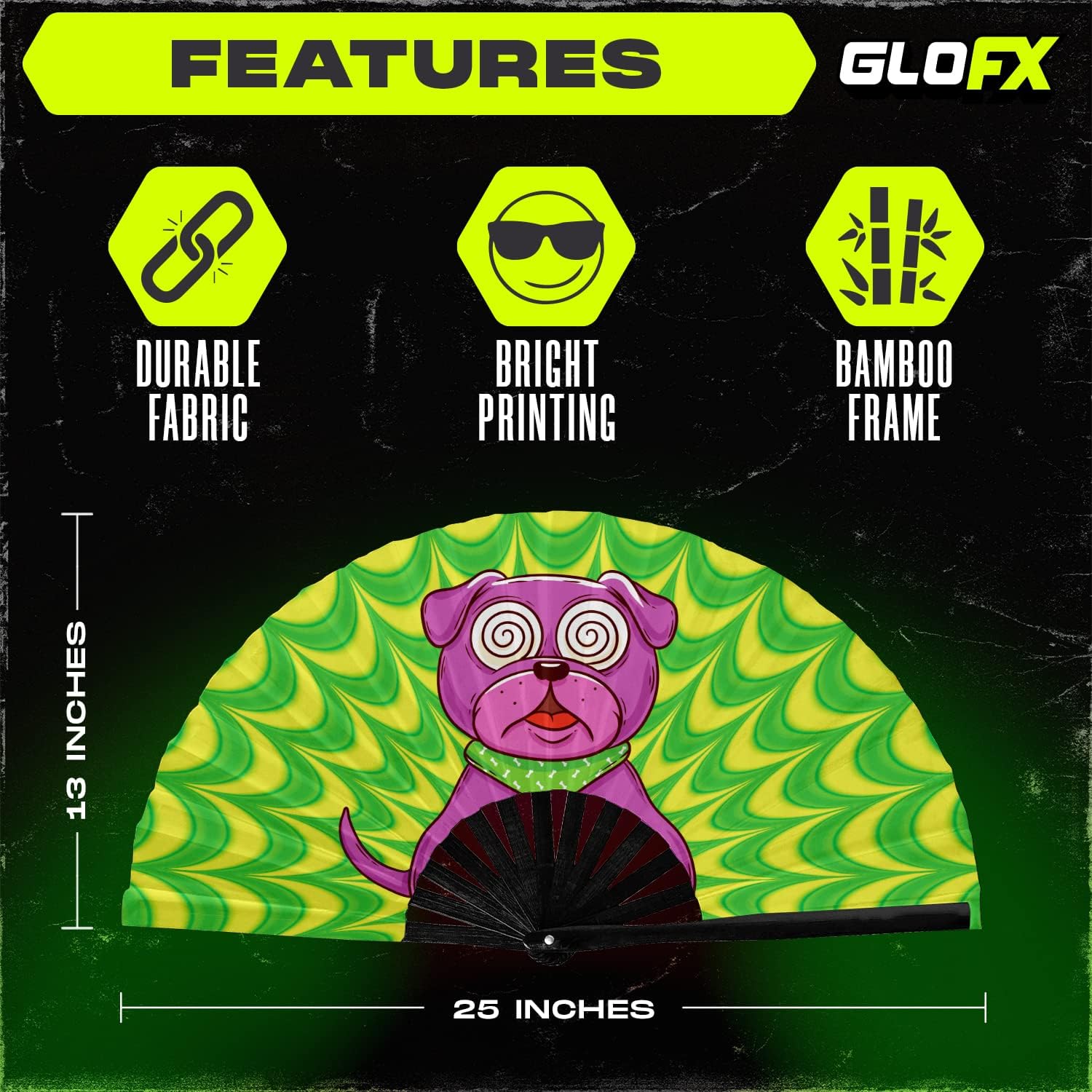 - ECLECTIC TRIPPY DOG FAN: Immerse yourself in a world of vibrant hues and mesmerizing patterns with our GloFX Rave Fan featuring a Trippy Doggy design. This eye-catching visual delight adds an electrifying touch to your ensemble, making it the perfect accessory for EDM events, music festivals, and beyond.