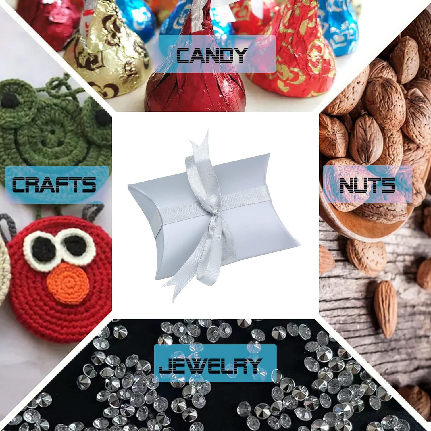 Aokbean 100 Pack Mini Pillow Candy Box Small Gift Boxes with 50 Yards Ribbon for Christmas Wedding Party Favor Gift, Jewelry or Soap Packaging (Pure Silver)