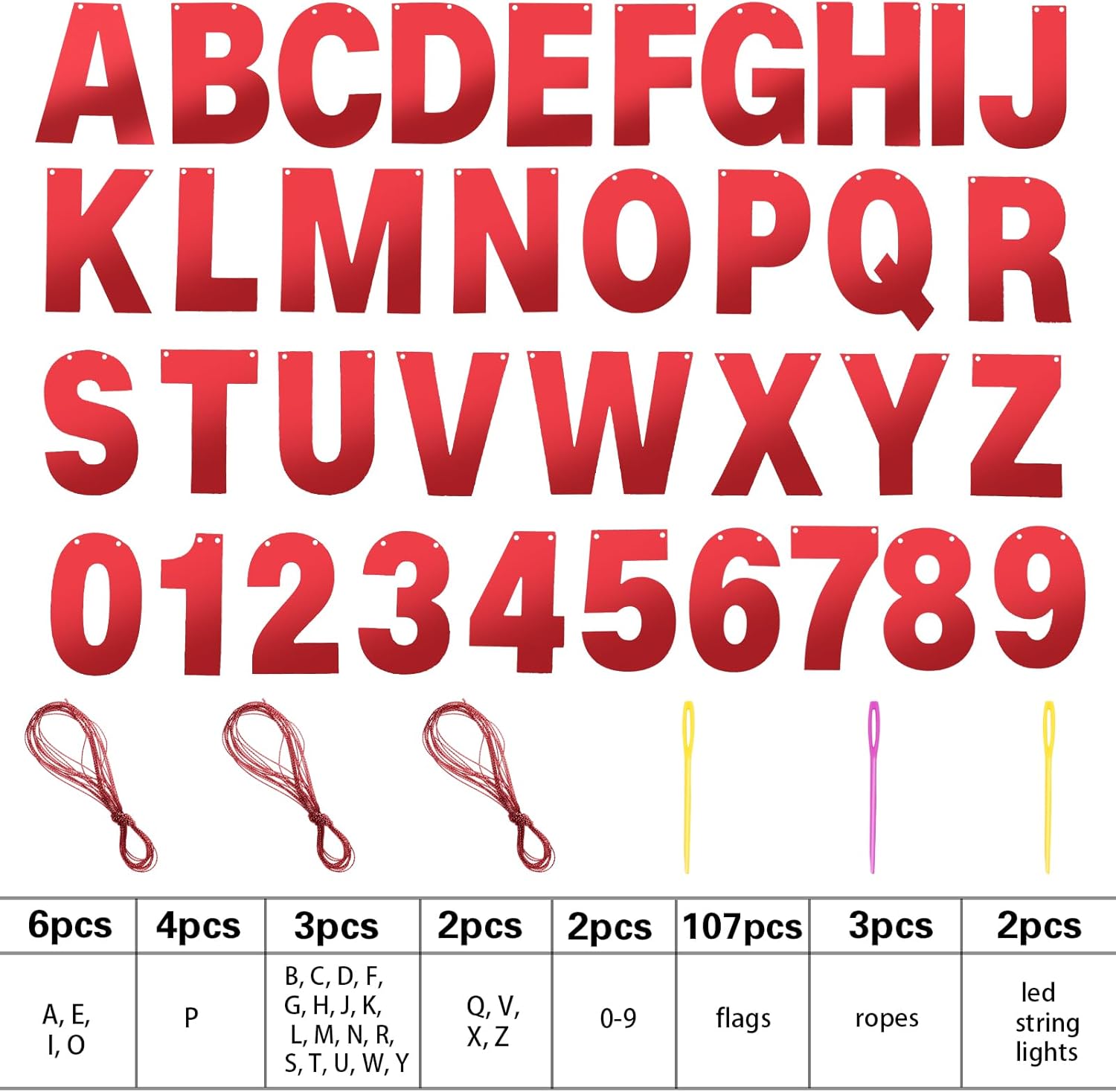 TaoBary 112 Pcs DIY Letter Kit Glitter Customizable Banner Letters Include 107 Letters and Numbers 3 Rope and 2 Needles for Birthday Halloween Christmas Wedding Valentine Party Decor(Bright Red)