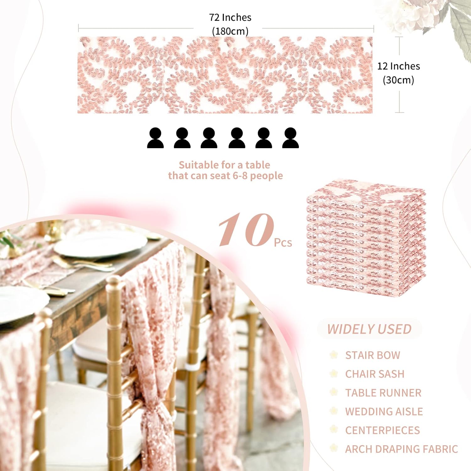 - Rose Gold Flower Sequin Table Runners: Package includes 10 pack of rose gold flower table runners for your daily use. Measured about 12x72 inches(30x180cm). Great ideal for wedding table decorations for the receptionthe sequin table runners is long enough to fit rectangle and round tables that can seat 6 to 10 people.