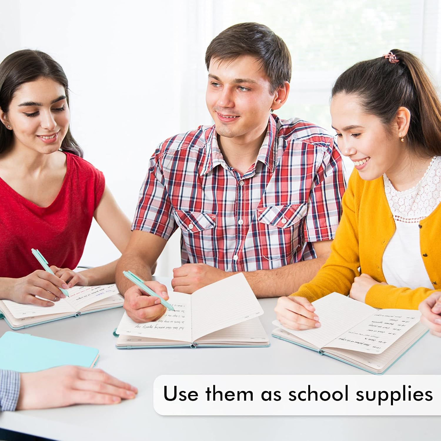 - feela 24 Pack Classic Ruled Notebooks contains 24 sky blue ruled sturdy cover notebooks and 24 Black Retractable Pens. Each of the notebooks measures 8.3” x 5.1”, which is perfect to carry and easily held by young girls and boys. These black cute pens are customized to be placed in the pen holder, which is pretty convenient.