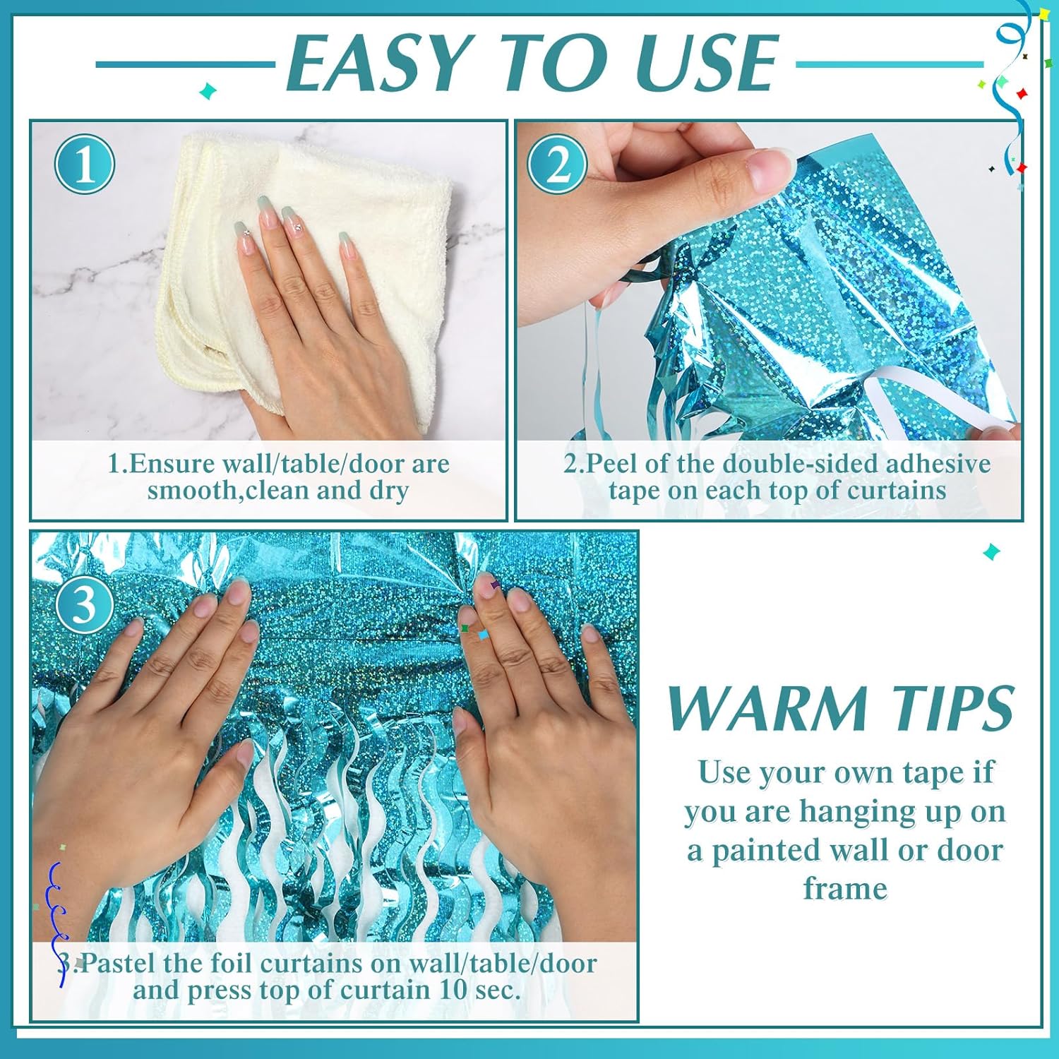 - Easy to Assemble: the tinsel curtain backdrop has a tape behind it for you to stick on decorative places such as walls, windows, tables and doors to create a blue green world, full of romantic atmosphere, so that you and your partners can have fun, and you can take pictures for memory