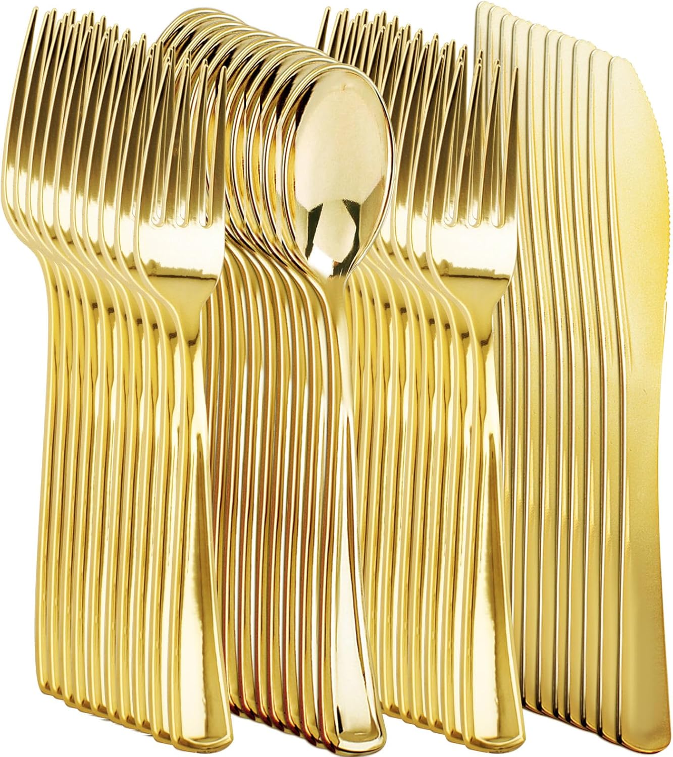 - ăGREAT VALUE PACKAGEăOur gold plastic silverware includes 200 forks, 100 knives and 100 spoons, which can serve 100 guests at once.