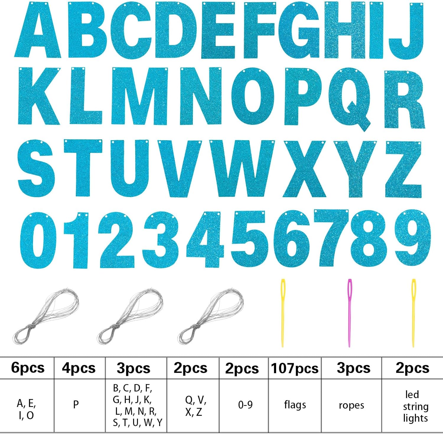 TaoBary 112 Pcs DIY Letter Kit Glitter Customizable Banner Letters Include 107 Letters and Numbers 3 Rope and 2 Needles for Birthday Halloween Christmas Wedding Valentine Party Decor(Baby Blue)