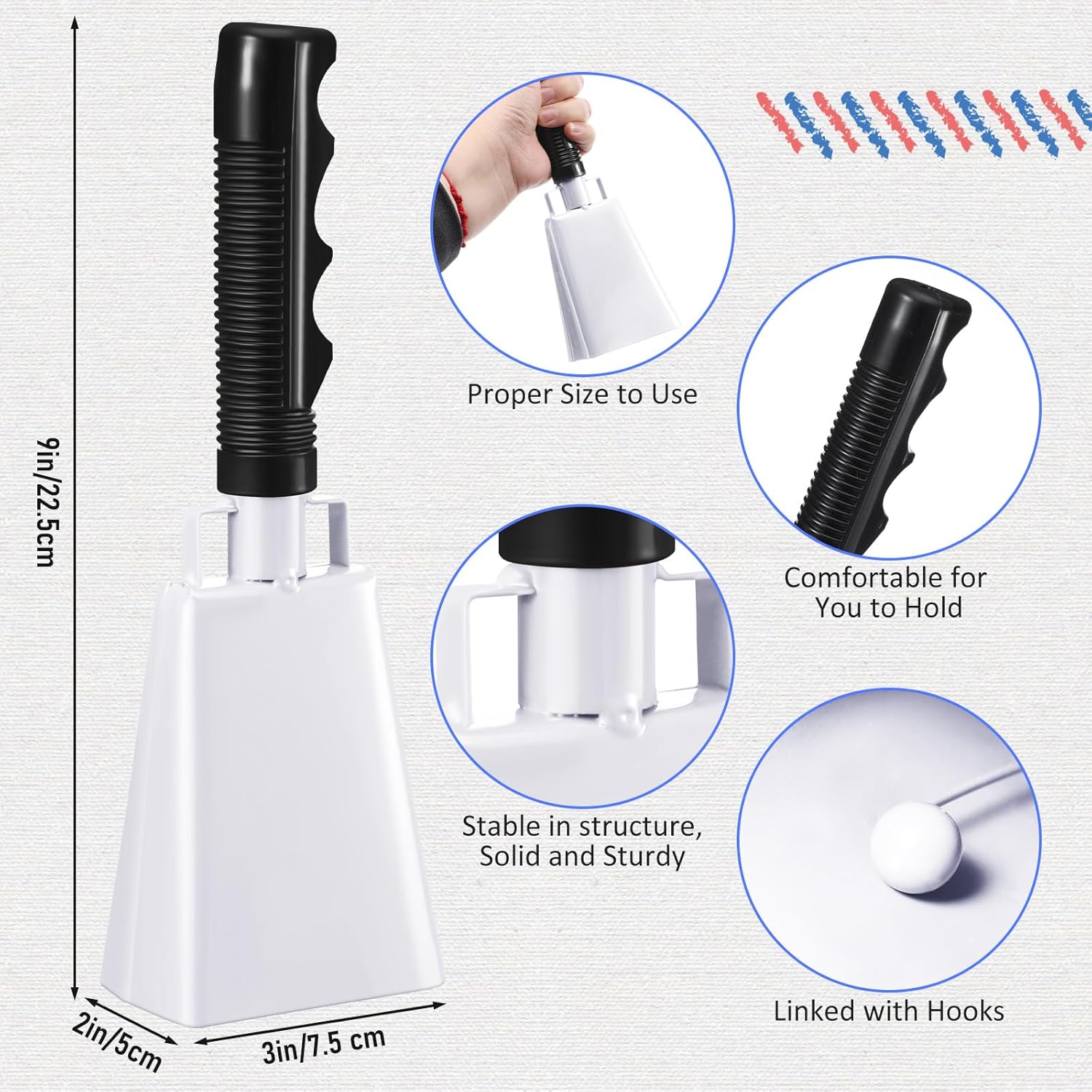 - Durable and Comfortable Quality: the cowbells for sporting events are made of iron and PVC rubber, which are durable and sturdy, comfortable and long serving, anti rust and safe, and not easy to break or fade away; The handle is also designed to provide a comfortable grip, so you can use it for extended periods