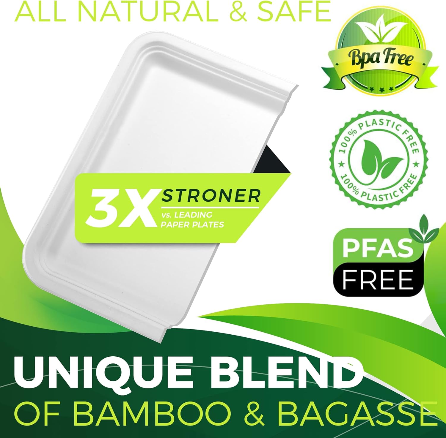 - 🌿 【Plant-Based Material & Safe】- All trays are made from natural materials. They are grown and harvested ethically and can be replaced within. All trays comply with USA and European ASTM D6400 & EN13432 High Standards for compostability. NO BPA, NO PFAS, NO Wax Lining & NO Chlorine Chemicals that may be found in plastic or paper trays. NO TREE is cut down to create these sturdy and disposable trays.