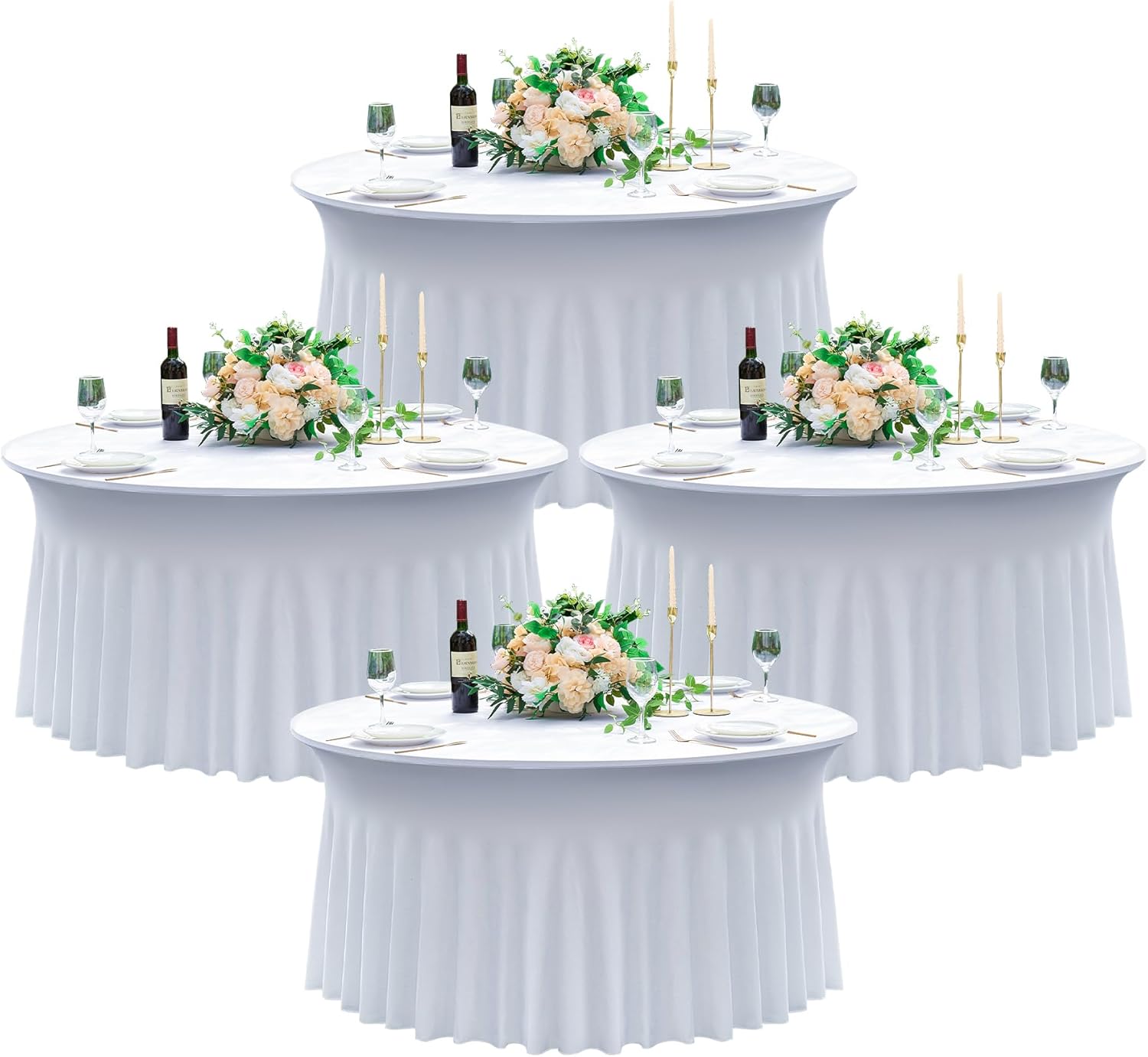 4 pk White Round Spandex Tablecloth for 60in Tables, Wrinkle Free Stretchy 120inch Fitted 5FT Table Cloths Round Table Covers with Skirt for Wedding Party Dining Banquet Events