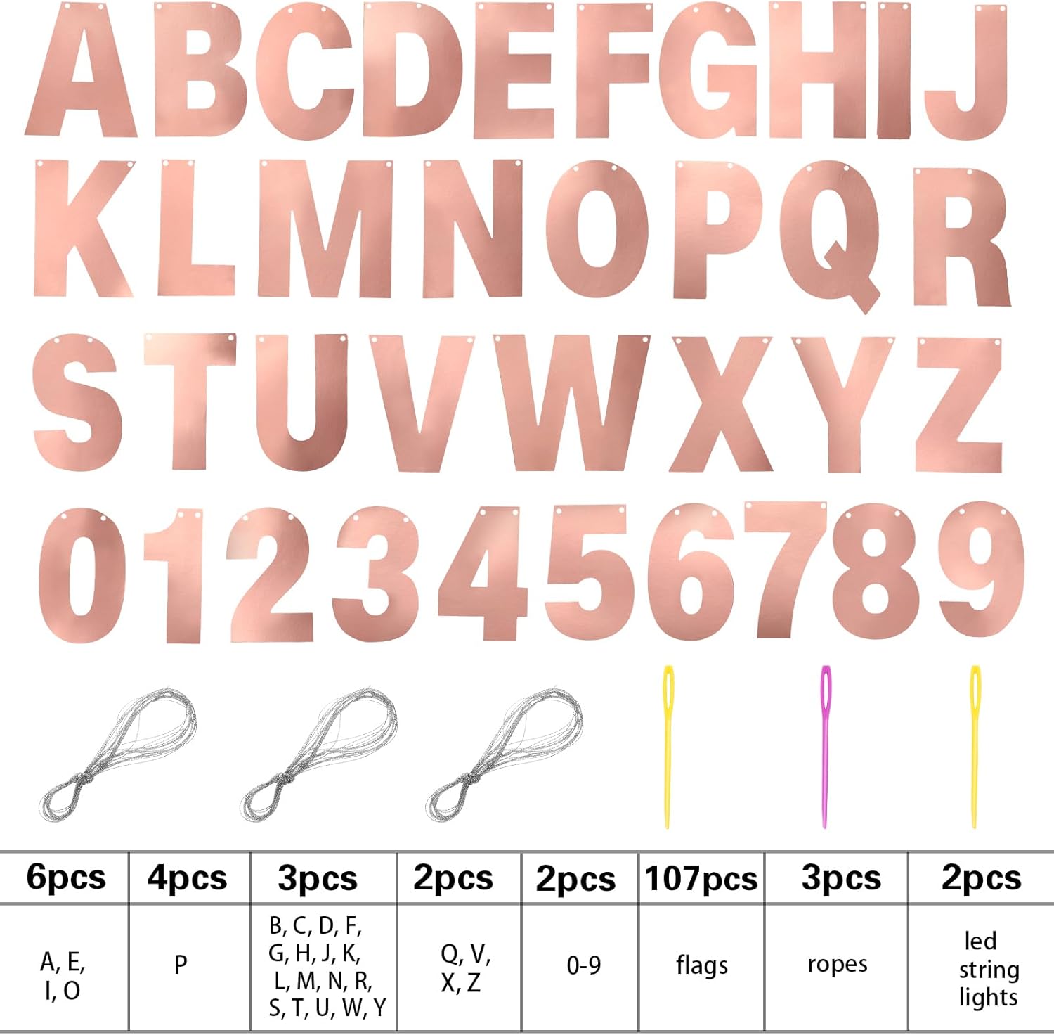 TaoBary 112 Pcs DIY Letter Kit Glitter Customizable Banner Letters Include 107 Letters and Numbers 3 Rope and 2 Needles for Birthday Halloween Christmas Wedding Valentine Party Decor(Bright Rose Gold)