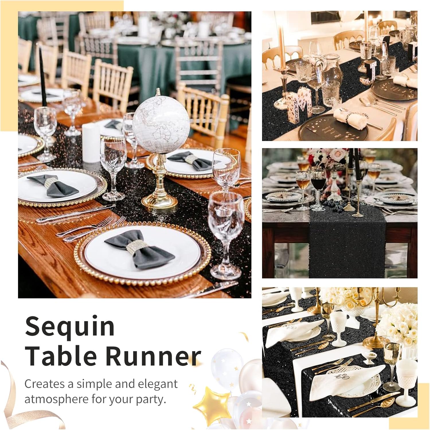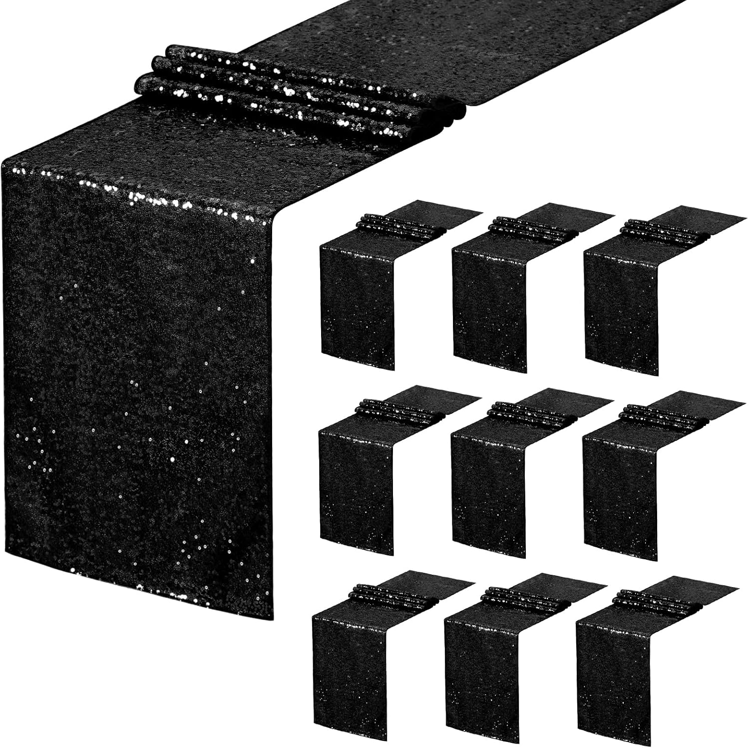 - Black Sequin Table Runners: Package includes 10 pack of black table runners for your daily use. Measured about 12x108 inches(30x274cm). Great ideal for wedding table decorations, the sequin table runners is long enough to fit rectangle and round tables that can seat 6 to 10 people.