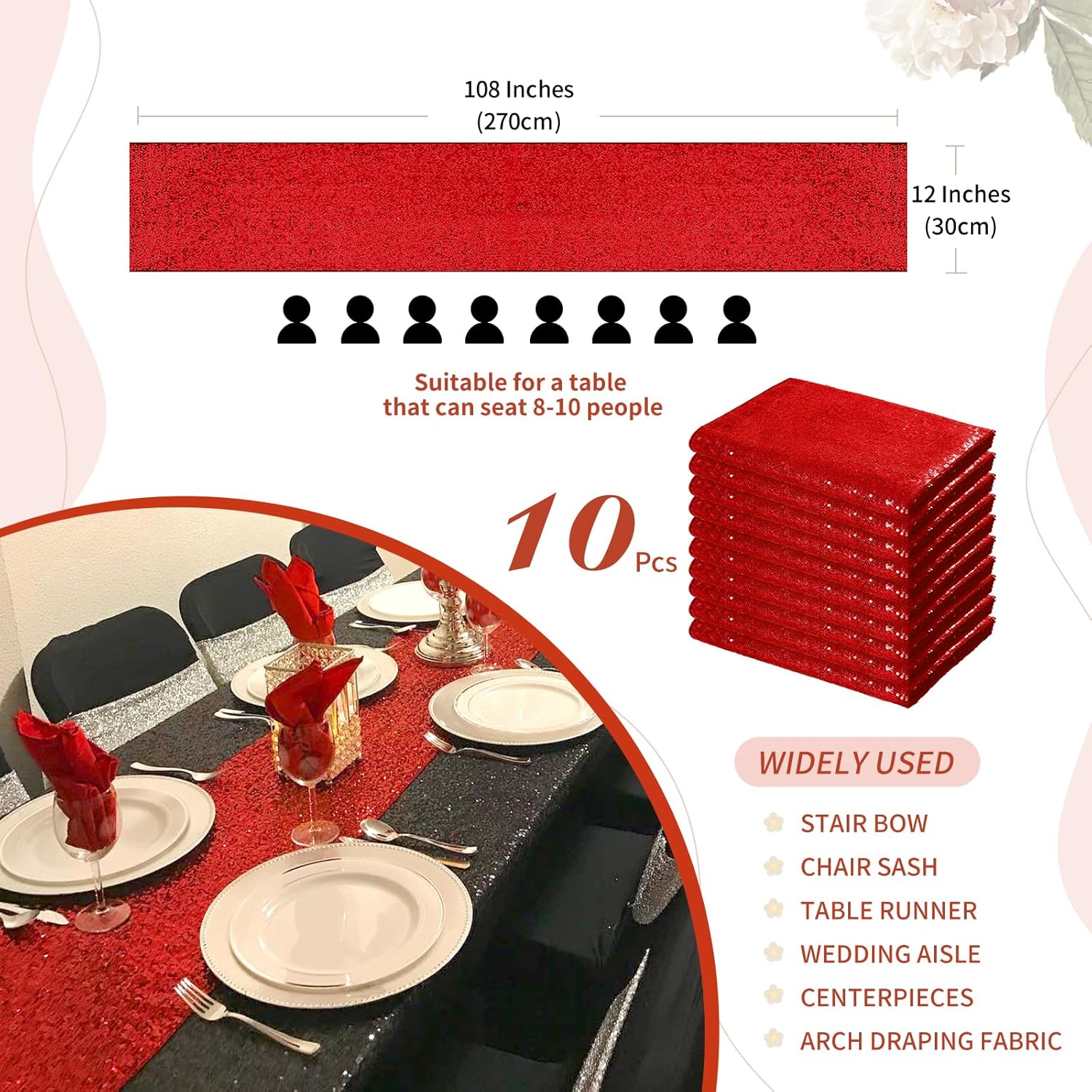 - Red Sequin Table Runners: Package includes 10 pack of red table runners for your daily use. Measured about 12x108 inches(30x274cm). Great ideal for wedding table decorations for the receptionthe sequin table runners is long enough to fit rectangle and round tables that can seat 8 to 12 people.