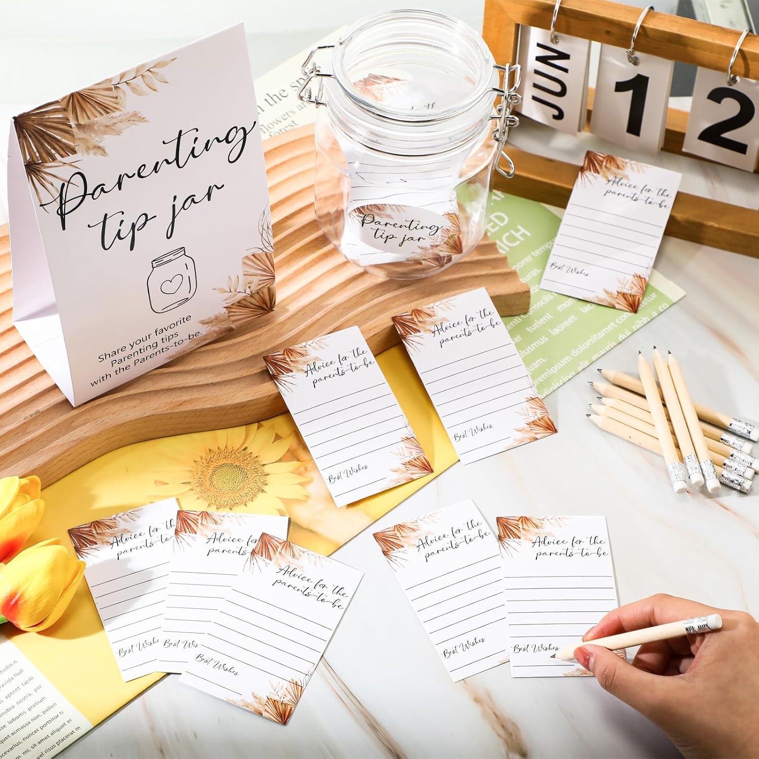Roowest Baby Shower to Baby Advice Cards for New Parents to Be - Tip Jar Sign for New Parents 60 Parenting Advice Cards 10 HB Pencils 2 Cute Stickers 1 Pet Bottle for Guests Games(Boho)