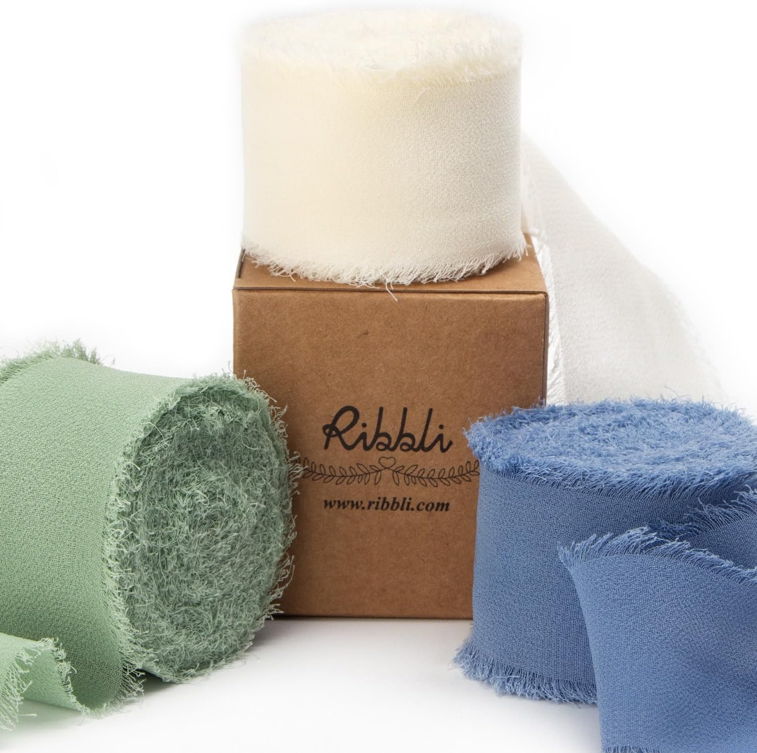 Ribbli Chiffon 1.5 Inch x 30 Yard Handmade Silk Ribbon - Ivory/Sage Green/Dusty Blue Fringe for Wedding Invitations, Bridal Bouquets, Wrapping, Flower Arrangement Decoration