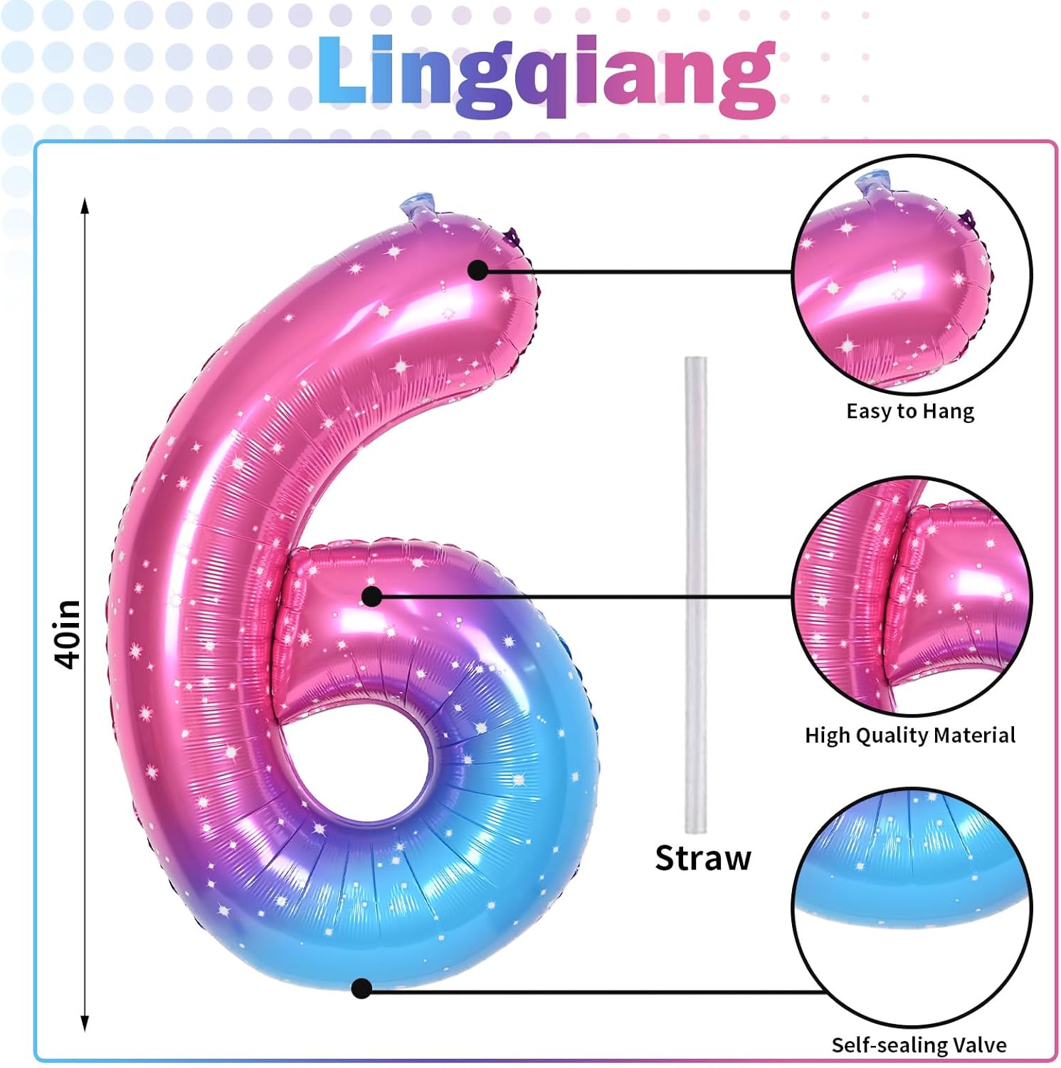 - π Gradient Rainbow Number 6 Balloon π - You will get 1pc 40 inch mylar foil pink blue starry number 6 balloon and 1pc straw. Perfect for 6th 16th 26th 60th 65th birthday or anniversary party decorations supplies.