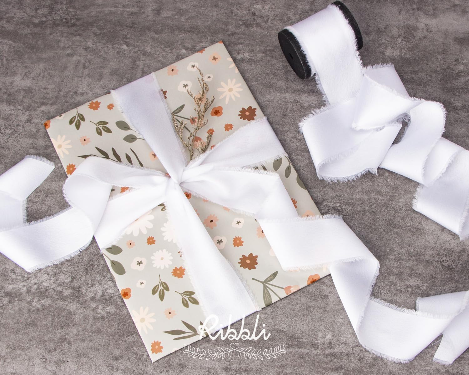 Ribbli White Silk Satin Ribbon 1.5 Inch x 12 Yard Handmade Frayed Chiffon Ribbon with Wooden Spool for Gift Wrapping, Wedding Invitations, Bridal Bouquets, Home Decor