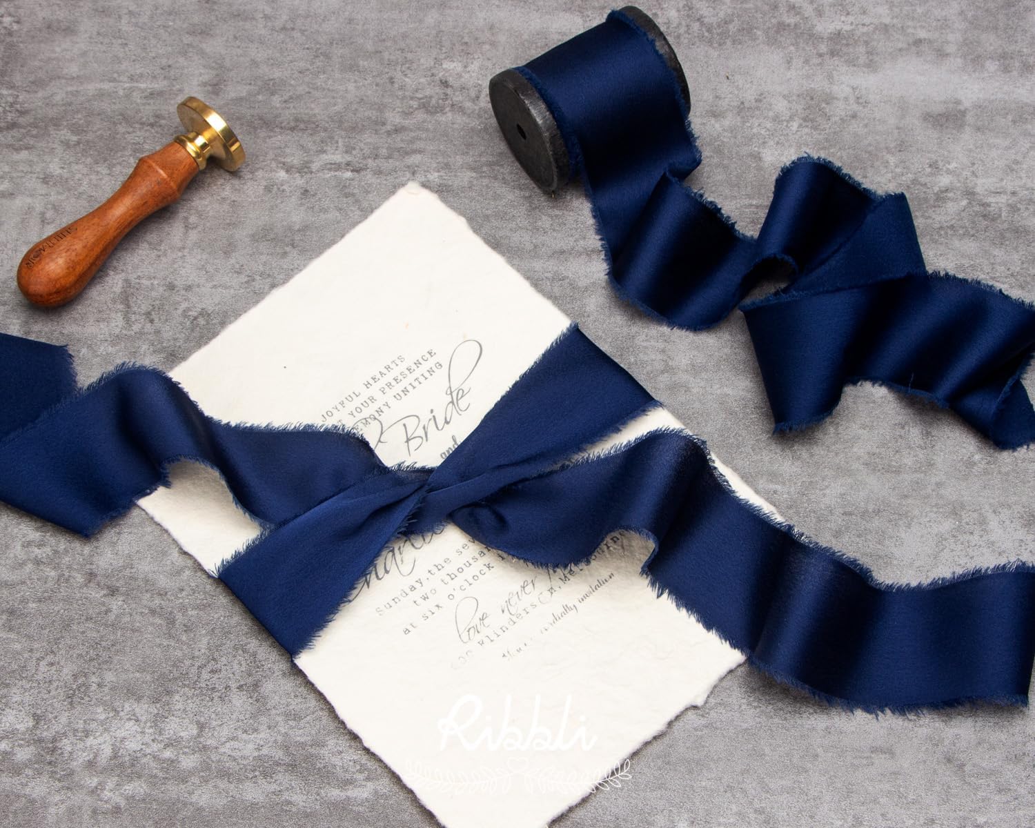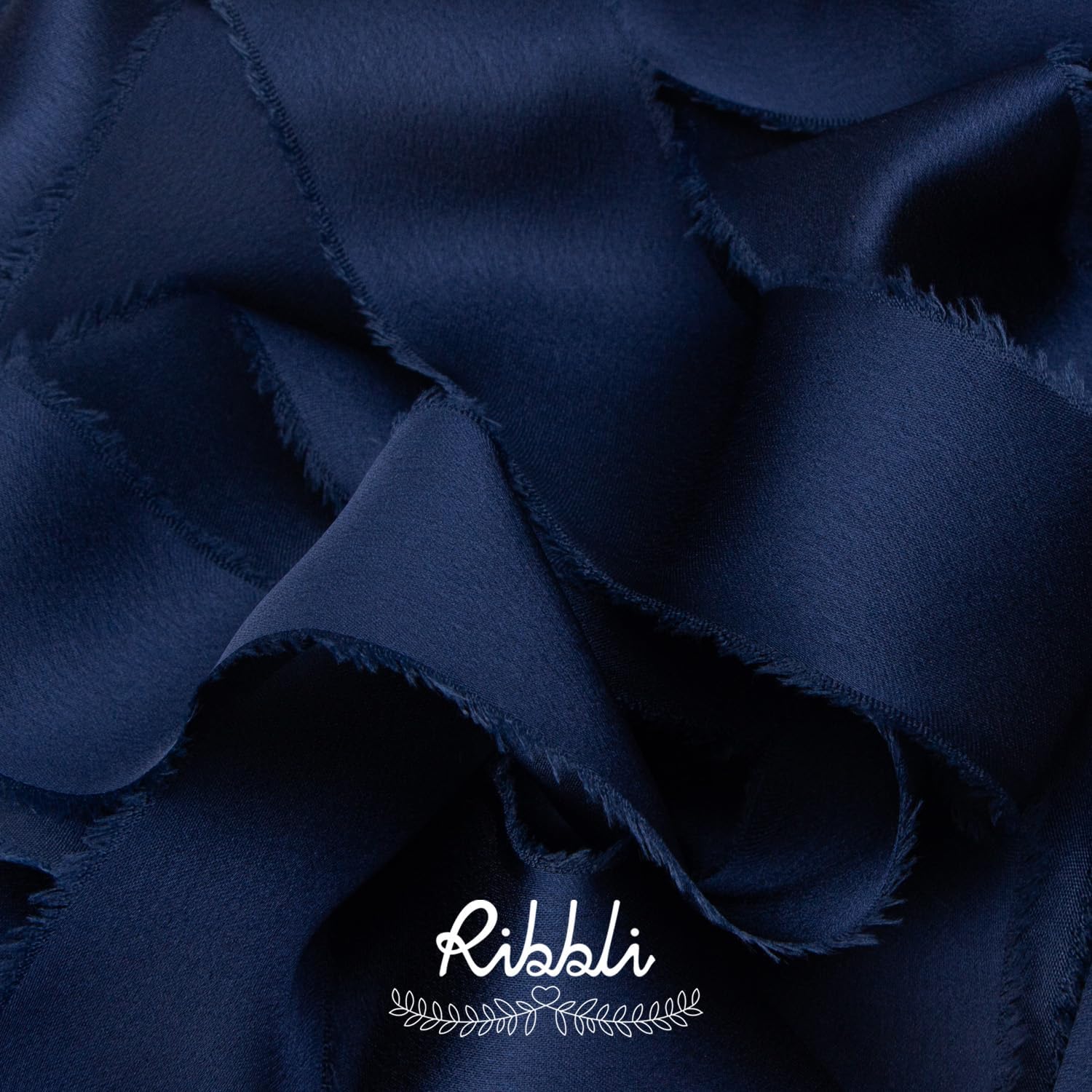 Ribbli Navy Blue Silk Satin Ribbon 1.5 Inch x 12 Yard Handmade Frayed Chiffon Ribbon with Wooden Spool for Gift Wrapping Wedding Invitations Bridal Bouquets Home Decor