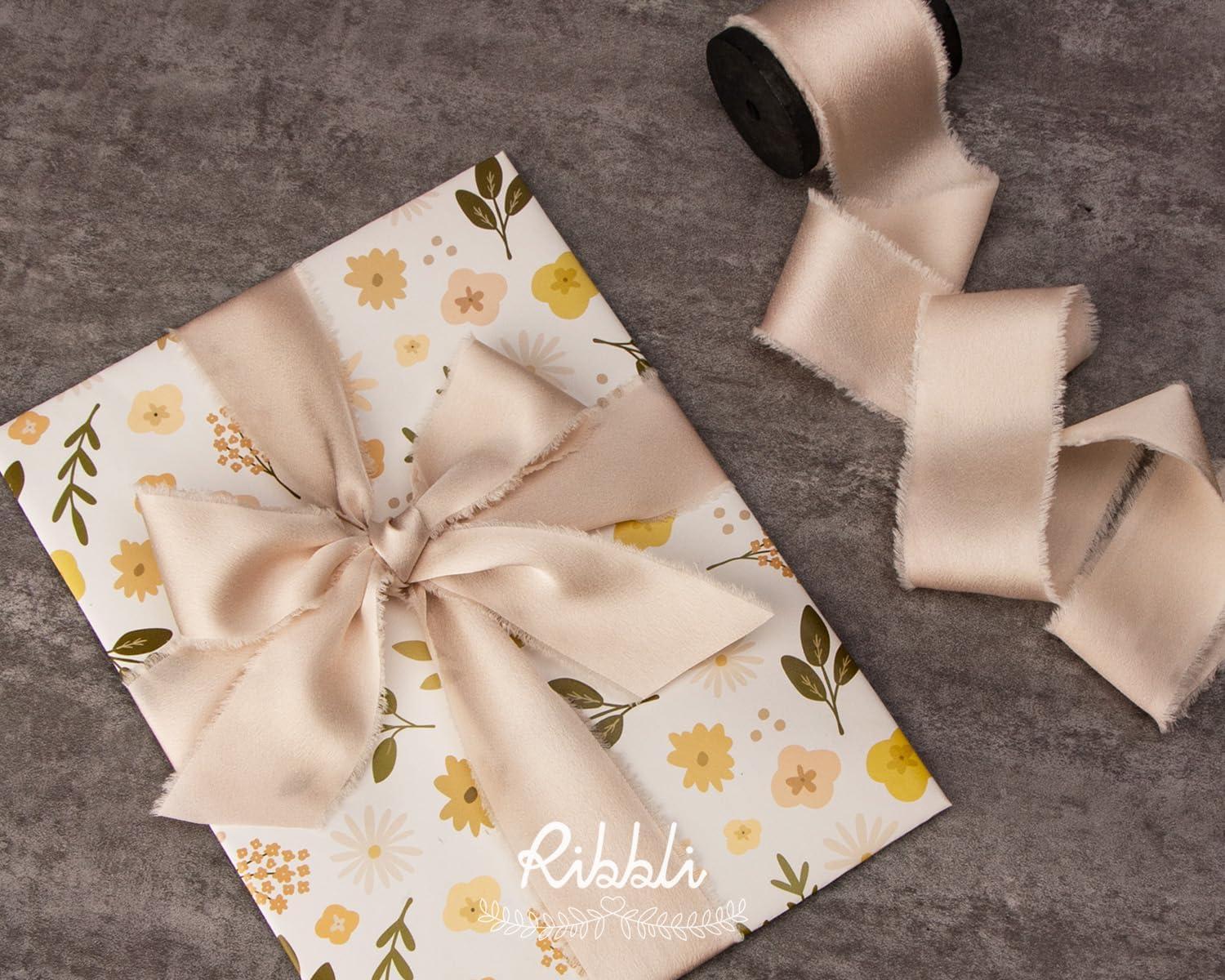 Ribbli Light Champagne Silk Satin Ribbon 1.5 Inch x 12 Yard Handmade Frayed Chiffon Ribbon with Wooden Spool for Gift Wrapping, Wedding Invitations, Bridal Bouquets, Home Decor