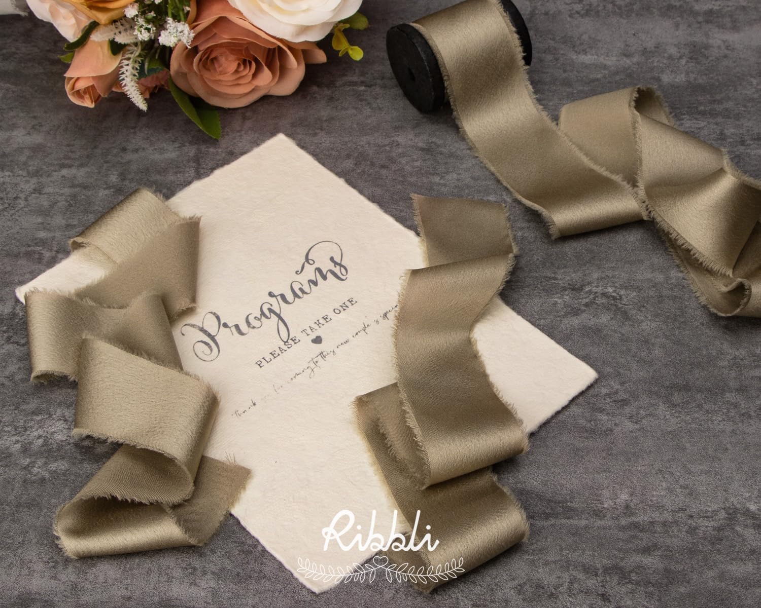 Ribbli Champagne Gold Silk Satin Ribbon 1.5 Inch x 12 Yard Handmade Frayed Chiffon Ribbon with Wooden Spool for Gift Wrapping Wedding Invitations Bridal Bouquets Home Decor