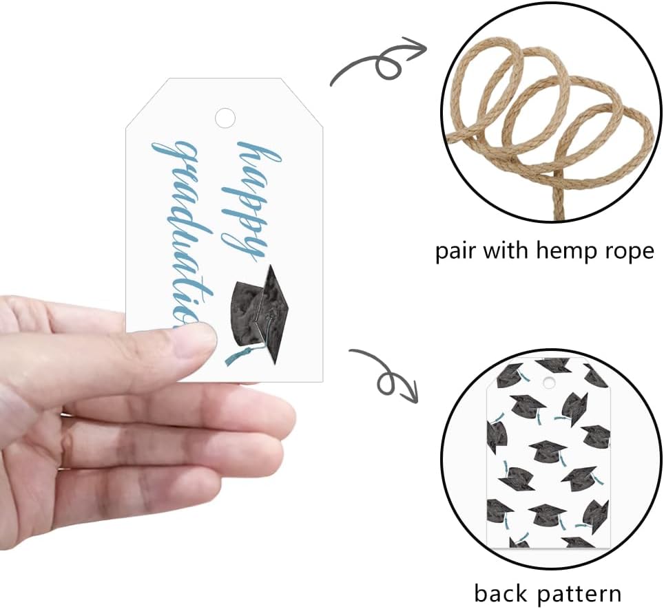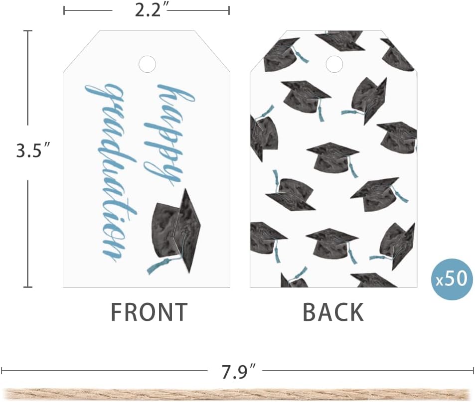 - Suitable Size: The size of the tag is about 2.2 inch x 3.5 inch, the hemp rope measures 7.87 inch x 50 Roots in length. Each graduation tag comes with holes pre - punched in the upper corners for string.