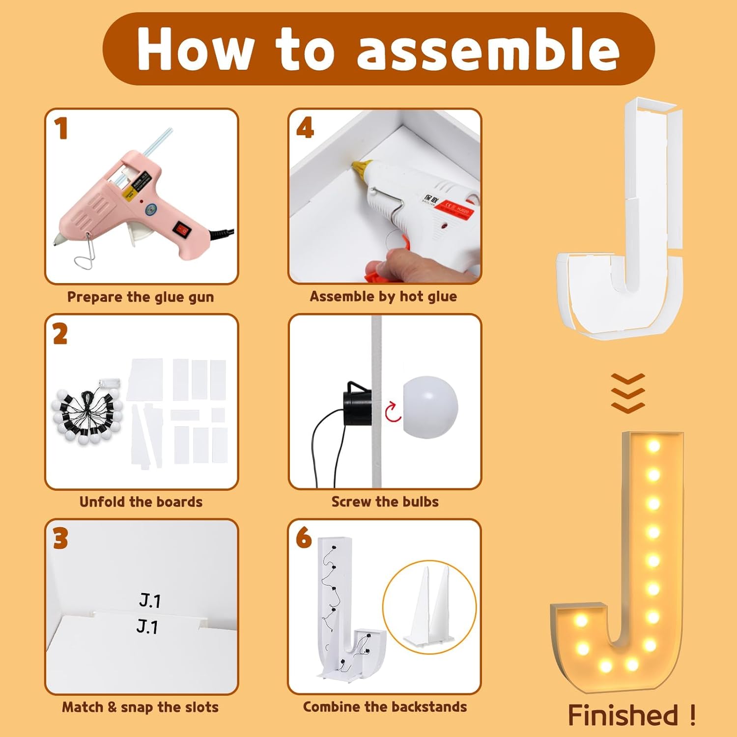 - Package Includes: A set of light up letters for party containing the pre-cut letter frames, a light string with several bulbs and the assemble instructions. ( Noted: Glue gun and batteries are not included