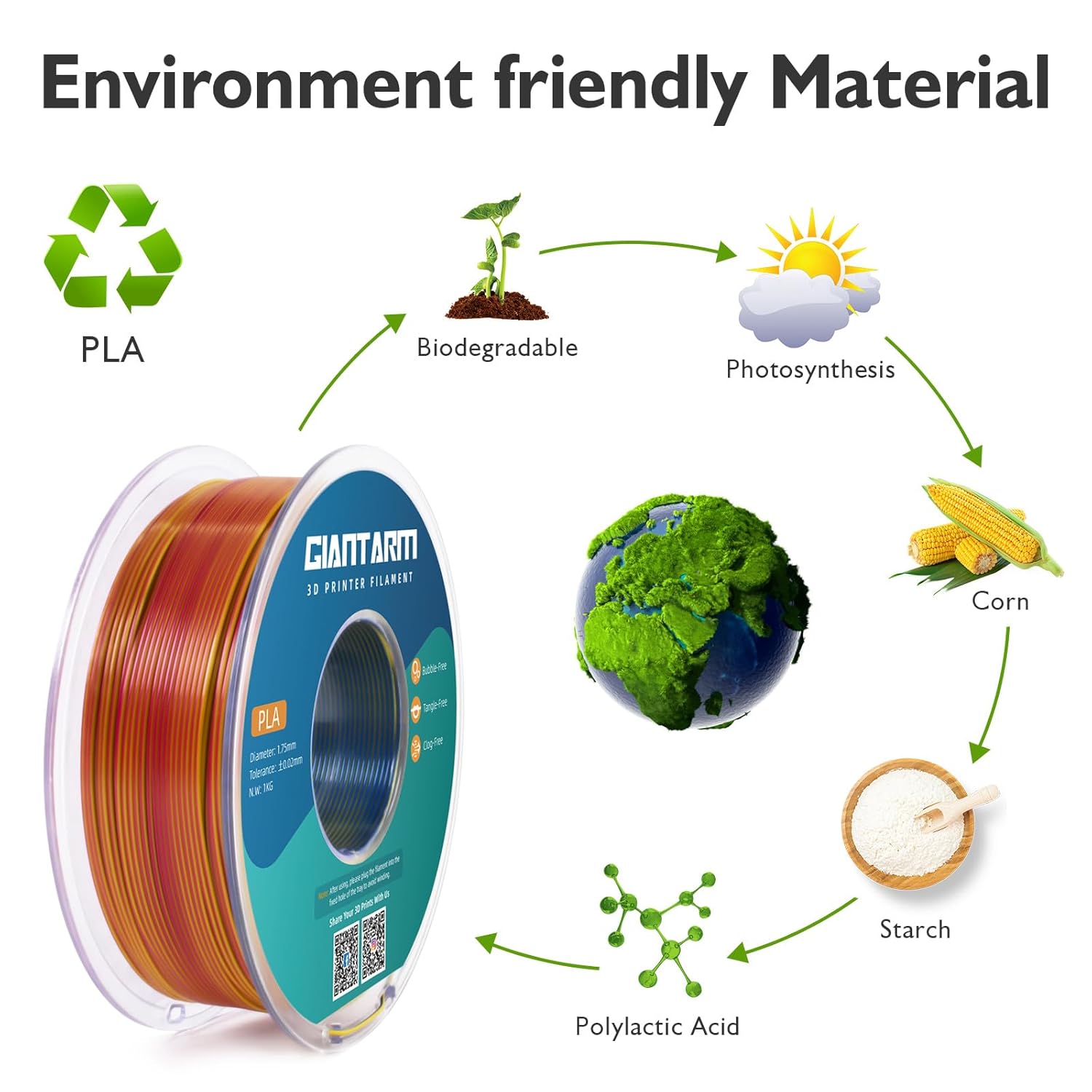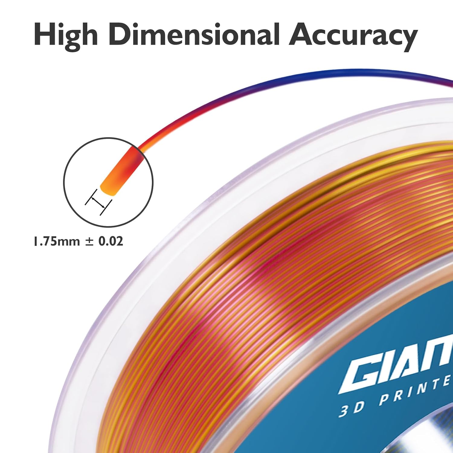 - 【Tri-Colors Silk PLA】GIANTARM three colors silk filament is a thread composed of three colors: orange, blue and green. You can change the visible color by adjusting the angle of silk filament.