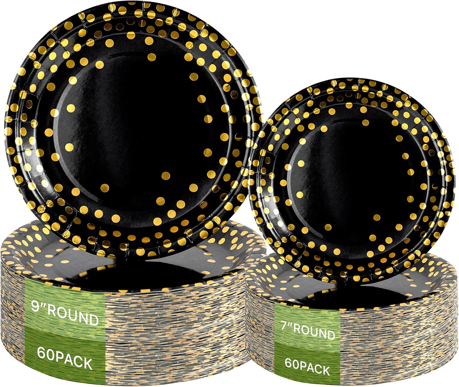 - CLASSIC DESIGN: The black paper plates are designed with classic gold polka dots, which is elegant and add a touch of glamour to your party or event. Your guests will like these pretty and elegant paper plates