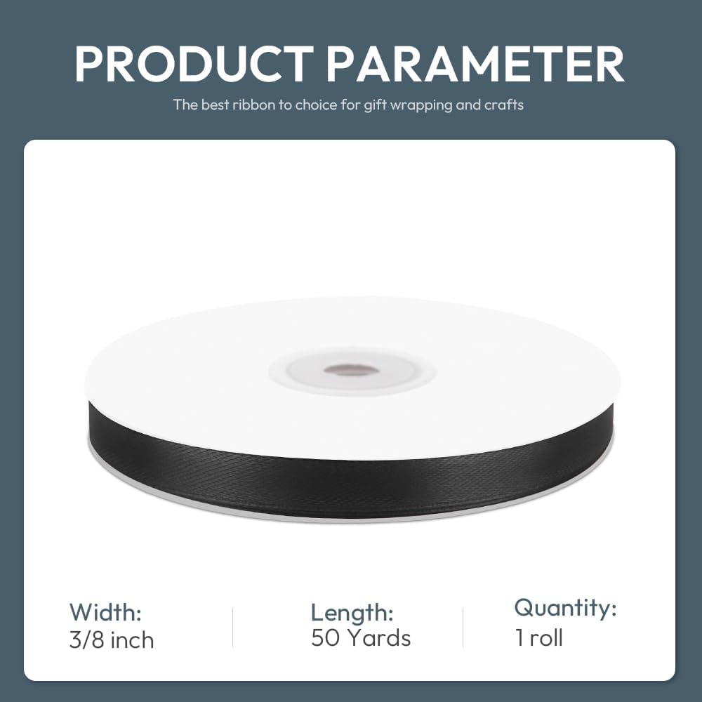 KMER LIFE 3/8" Wide x 50 Yards Black Single Faced Polyester Satin Ribbon, Black Satin Ribbon Perfect for Wedding Decor, Wreath, Crafts, Gift Wrapping & Other Projects (Black)
