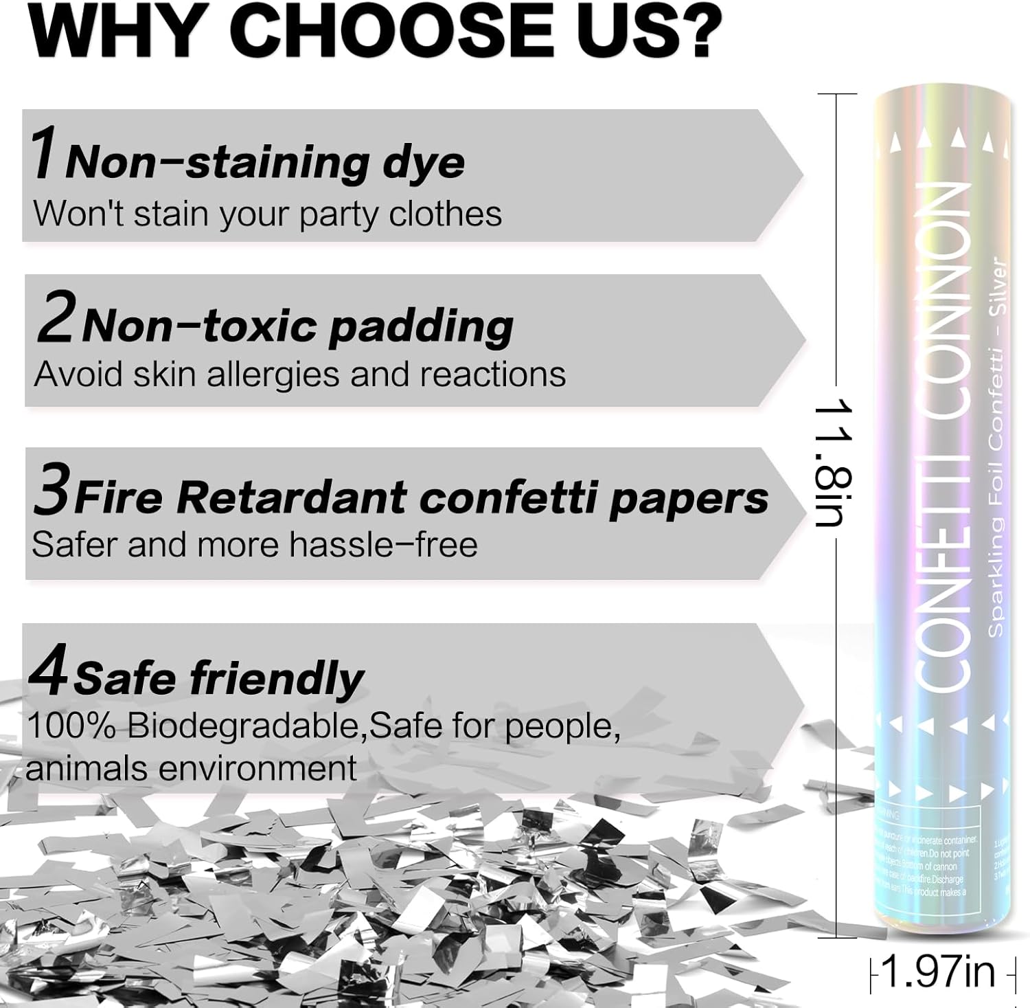- Versatile Party Confetti Cannon: Our silver confetti cannons are the perfect accessory for any event, from weddings to birthday parties to family reunions. With their eye-catching silver confetti and impressive shooting range, they're sure to be the life of the party, adding a touch of sparkle and elegance to every occasion.