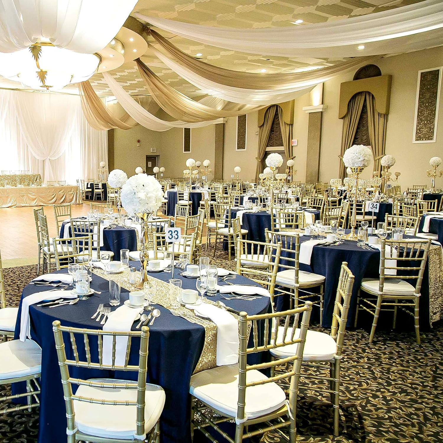 - š„ćSizećThis Navy Blue polyester table cloth diameter is 108 Inch, for standard 6ft(72inch) round table, providing 18 inch drop, If your round table is 8ft(96inch), providing 6 inch drop. We can provide the following sizesļ¼Round: 60", 90", 108", 120".Please measure the size of your table before purchasing.