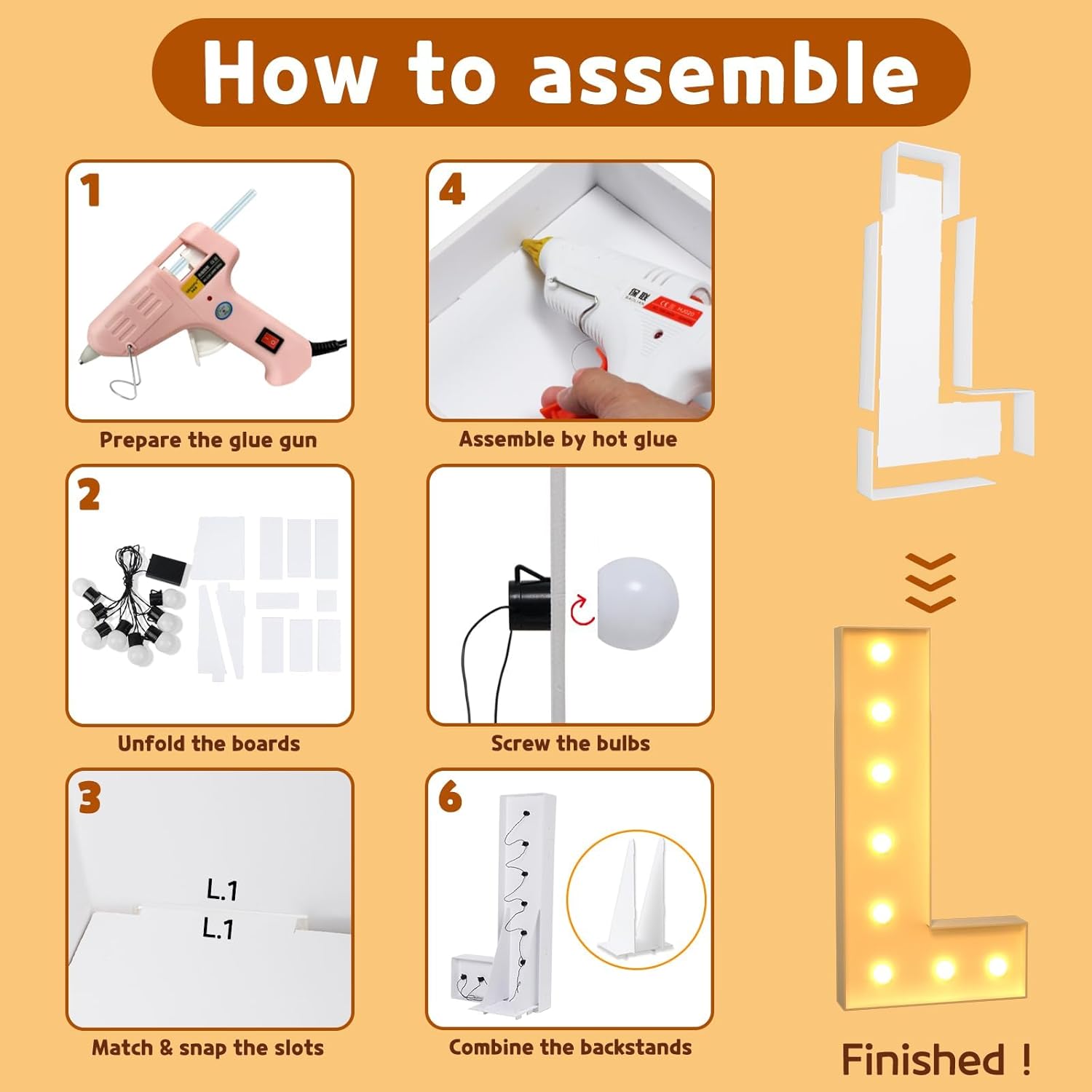 - Package Includes: A set of light up letters for party containing the pre-cut letter frames, a light string with several bulbs and assemble guiding manual. ( Noted: Glue gun and batteries are not included