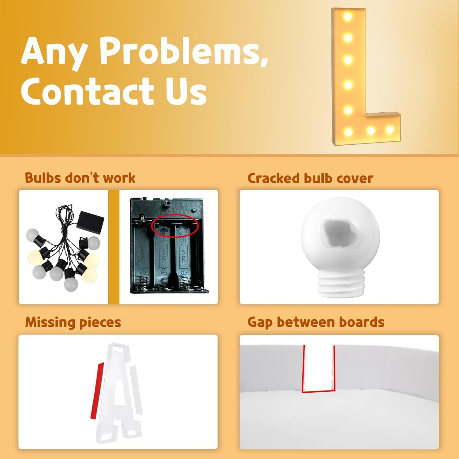 - Need to Assemble: 3 ft marquee letters are pre-cut frame with slots, 1) Match the slots on the board and put all boards together by hot glue; 2) Screw the bulbs on the board and install 3 AA batteries