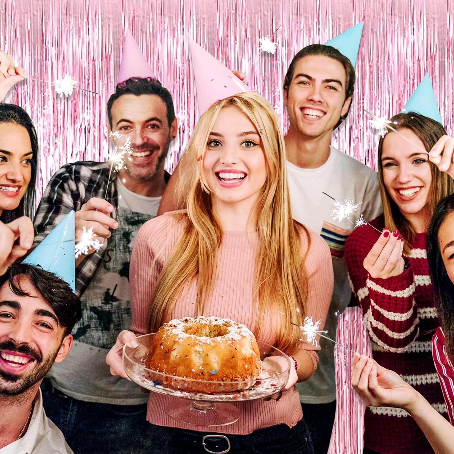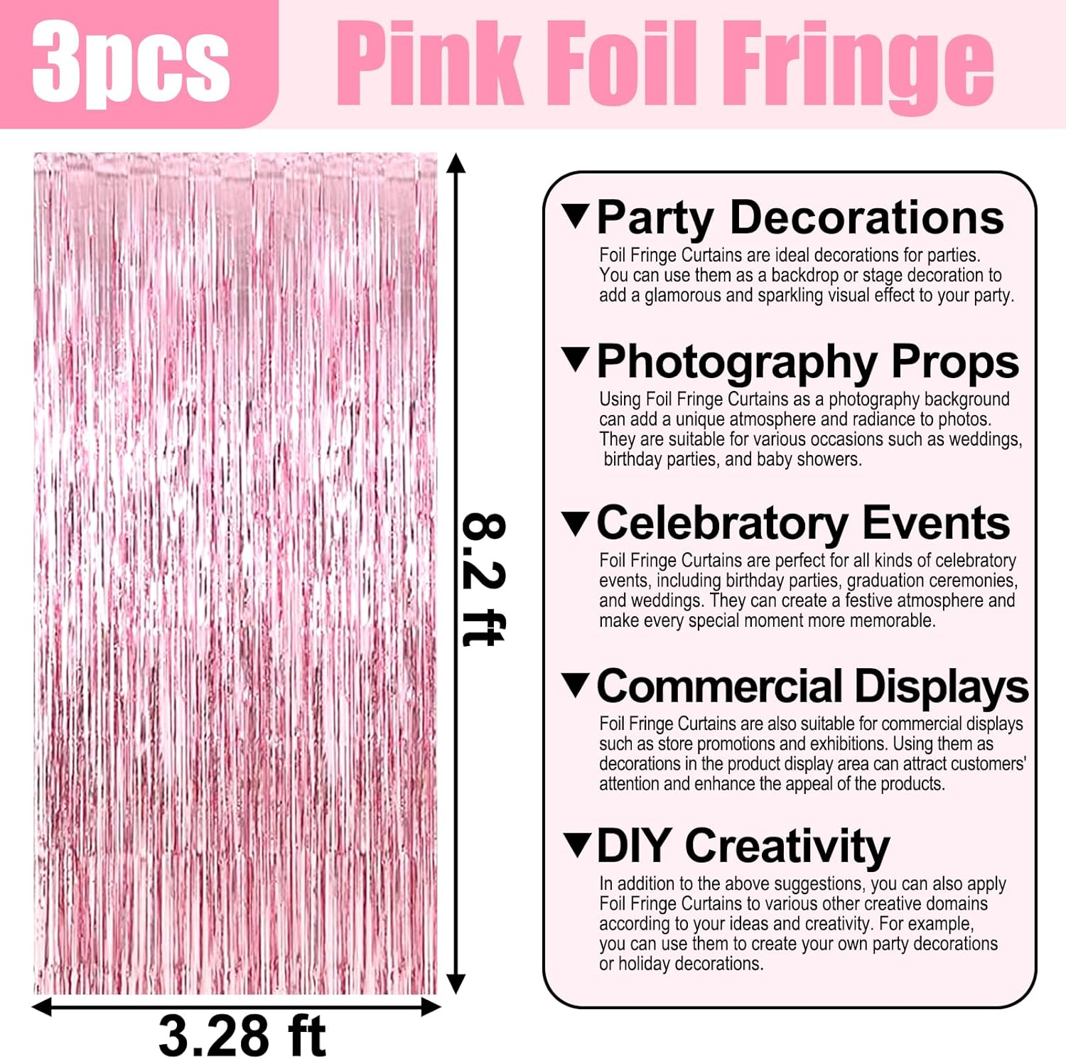 3 Pack Pink Foil Fringe Curtain Backdrop, 3.28Ft x 8.2Ft Metallic Tinsel Foil Fringe Streamer Curtains for Photo Booth, Christmas Day, Thanksgiving, Wedding, New Year Party Decorations
