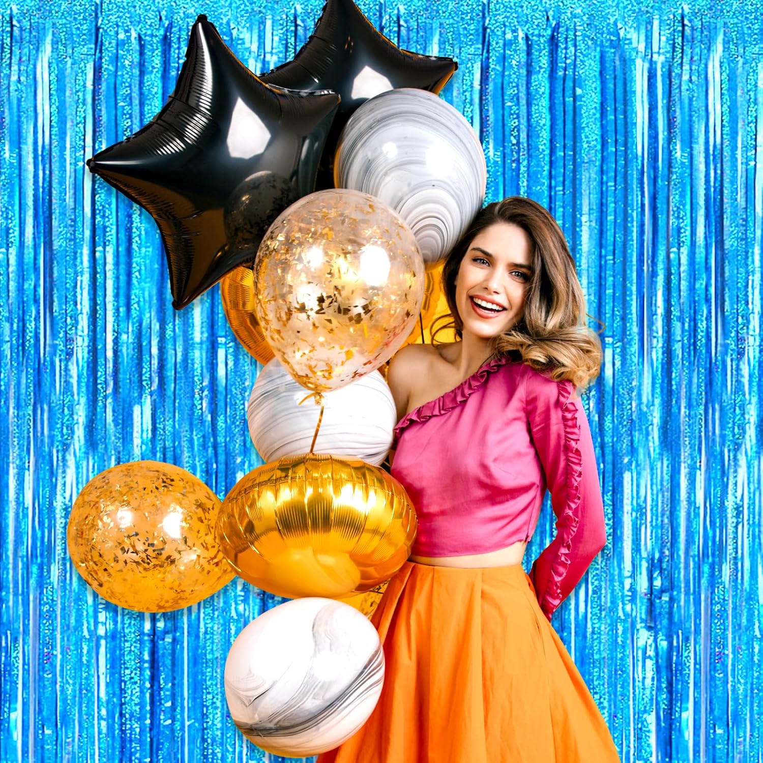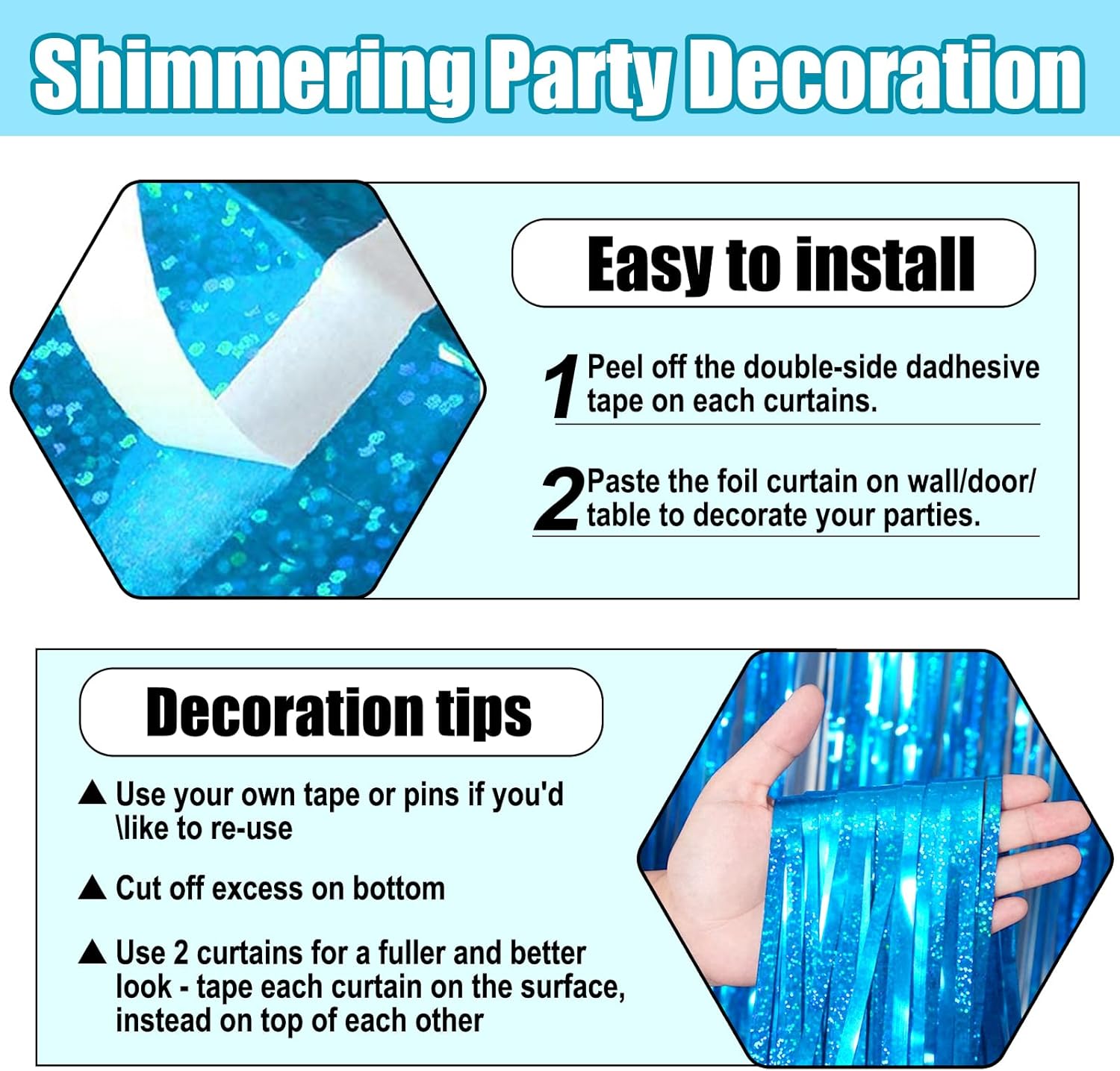 - 3.28Ft x 8.2Ft Feet | Vibrant Shiny Streamers : This sparkling tinsel blue fringe curtain is large size of 3.28ft x 8.2ft feet, pack of 3. Made of aluminium foil. This decorations for party backdrop will radiates laser like shine. and this will be a perfect party backdrop for the photo booth you had prepared for your friends and kids.