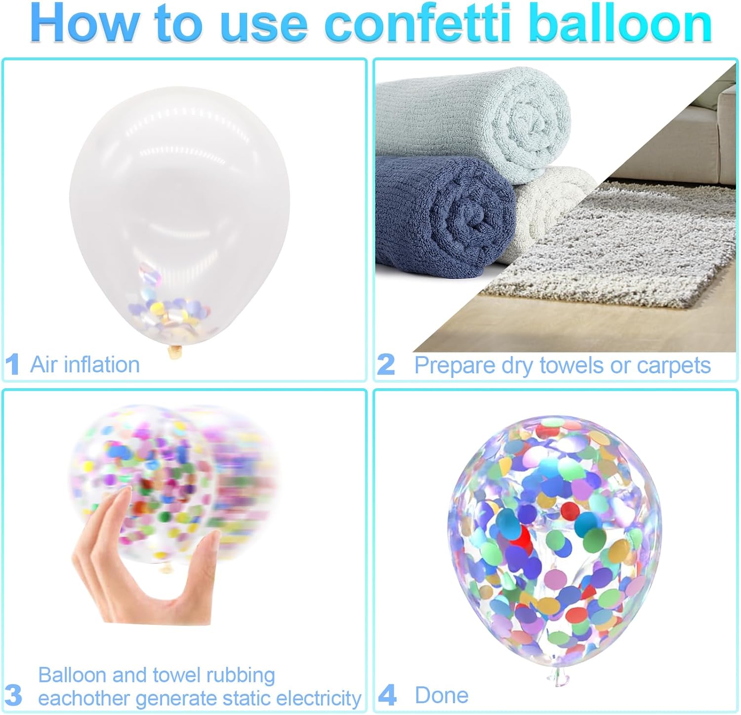 - 【How to Make Rainbow Confetti Balloon】- These colorful confetti latex balloons can inflate hydrogen, helium ( it will float for more than 12 hours), and air.The best way to rub the surface of the balloons is with a dry towel or hair and silk. And it is recommended to use a pump to quickly inflate so that confetti is easier to be stuck.