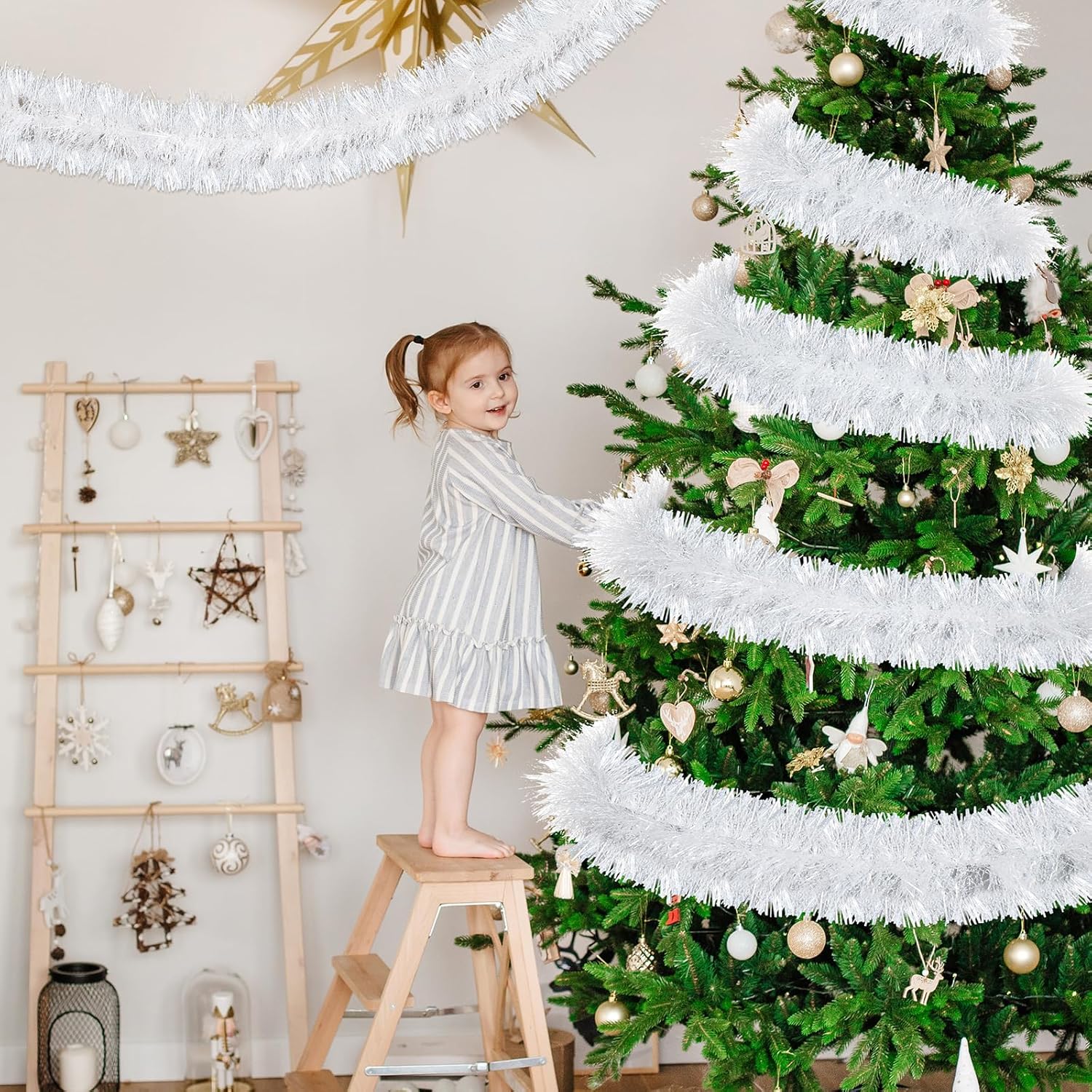 72 Feet Christmas Tinsel Garland Shiny Metallic Tinsel Twist Garland Streamers Ornaments Long Glitter Christmas Tree Hanging Decorations for Party Holiday Wedding Birthday Tree Wall Rail (Snowy White)