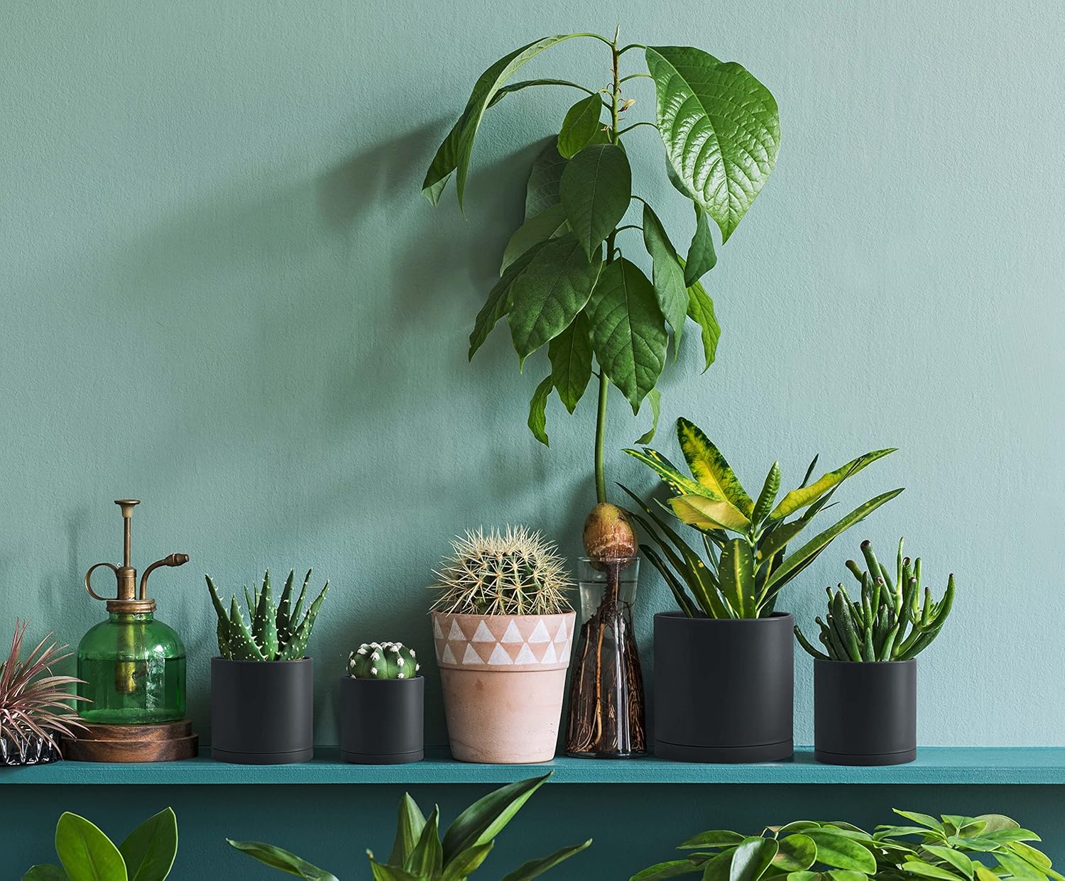 D'vine Dev 6 Pack 4 Inch Modern Plastic Plant Pots, Small Garden Planters for Plant with Drainage Holes and Saucers, Black Color, 74-Y-E-3