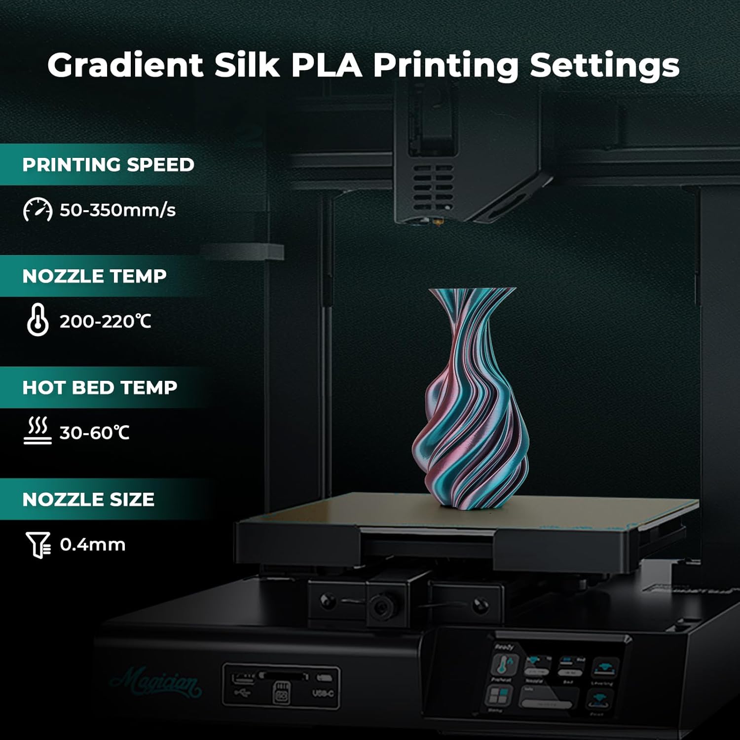 - Eye-catching Silk PLA: Shiny blue green and coral combination of magic 1.75mm PLA filament, make the two sides of your print appear in different colors. Without polishing, you can get a silk glossy and smooth 3d prints. Beginner & expert friendly, it’s your go-to for eye-catching designs all year round