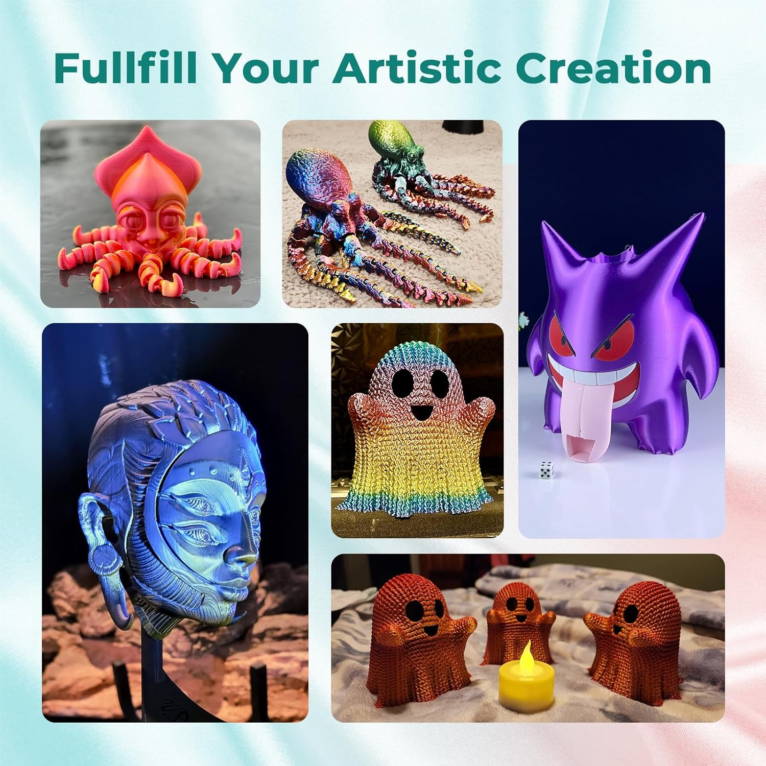 - Silk Dual Color PLA: Experiment with multiple hues without the commitment of larger spools. You can print beautiful multicolors in one PLA filament, perfect for arts, crafts, DIY. Whether you're crafting Easter decorations, designing Halloween costumes, creating Christmas ornaments, or making Valentine’s surprises, this filament delivers stunning results every time