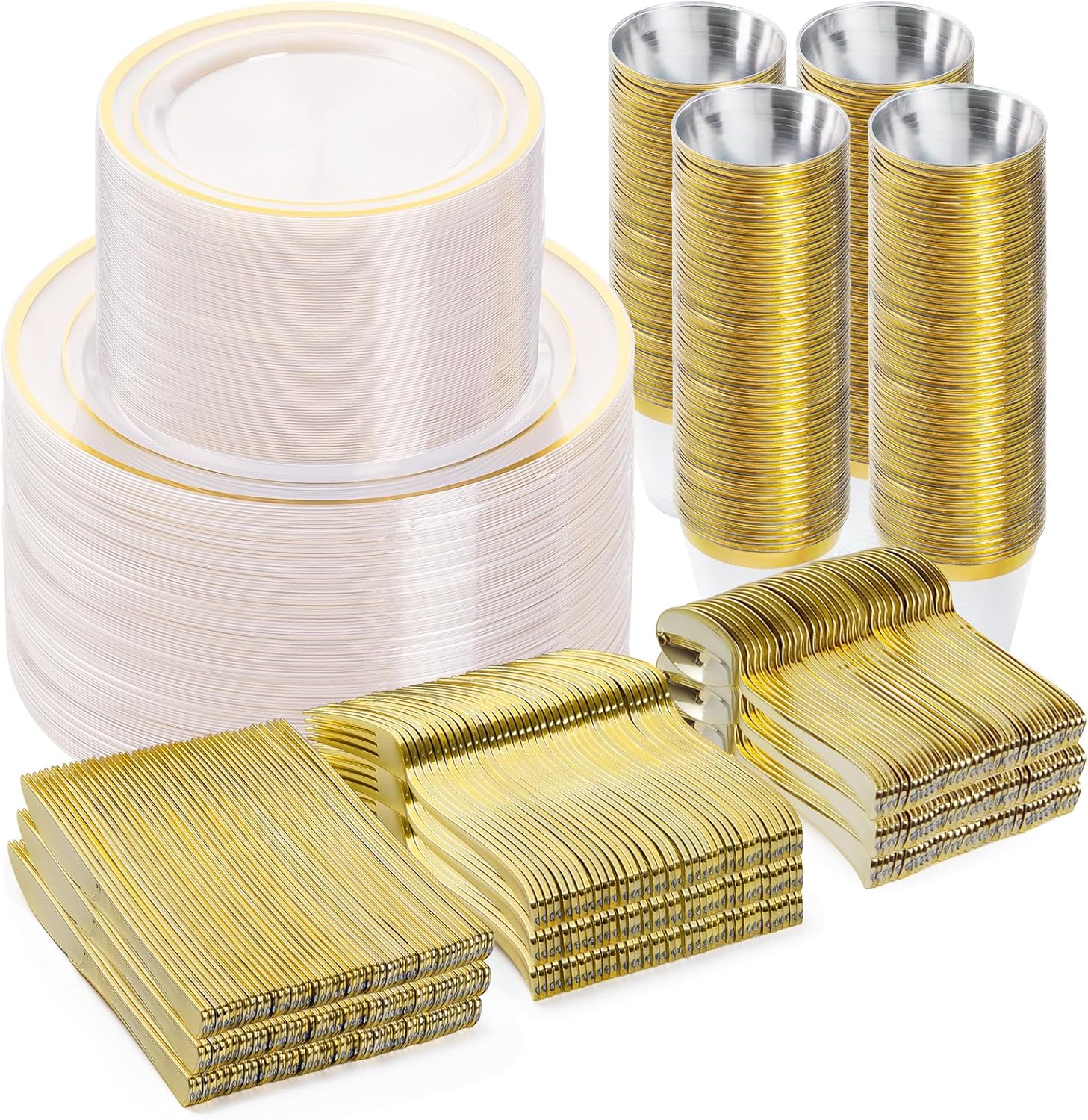 BESTVIP 600PCS Clear Gold Dinnerware Set for 100 Guests, Plastic Plates for Party, Christmas and New Year, 100 Disposable Plates, 100 Dessert Plates, 100 Cups, 100 Spoons, 100 Forks and 100 Knives