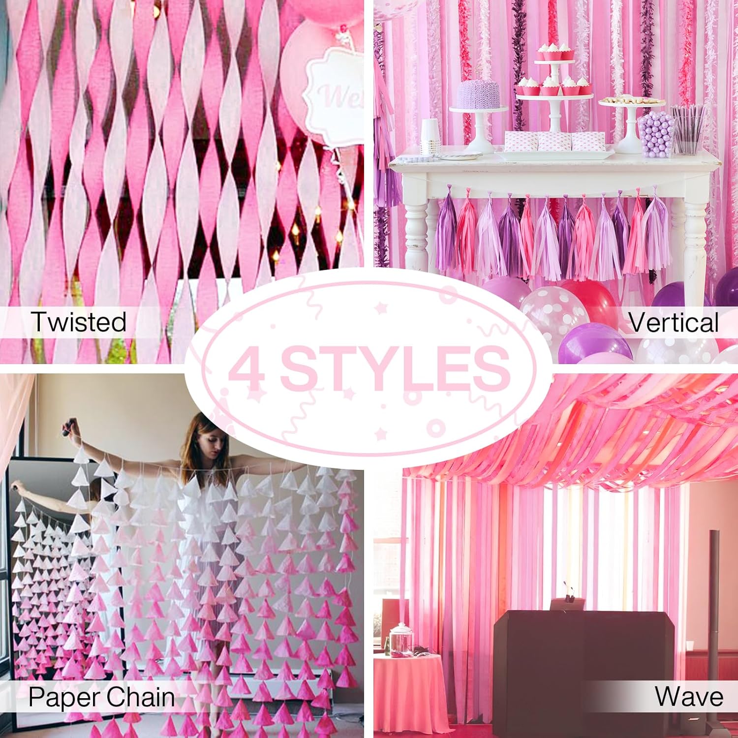 PartyWoo Crepe Paper Streamers 4 Rolls 328ft, Pack of Crepe Paper Perl Pink Streamers Decorations, Crepe Paper for Birthday Decorations, Party Decorations, Wedding Decorations (1.8 in x 82 Ft/Roll)