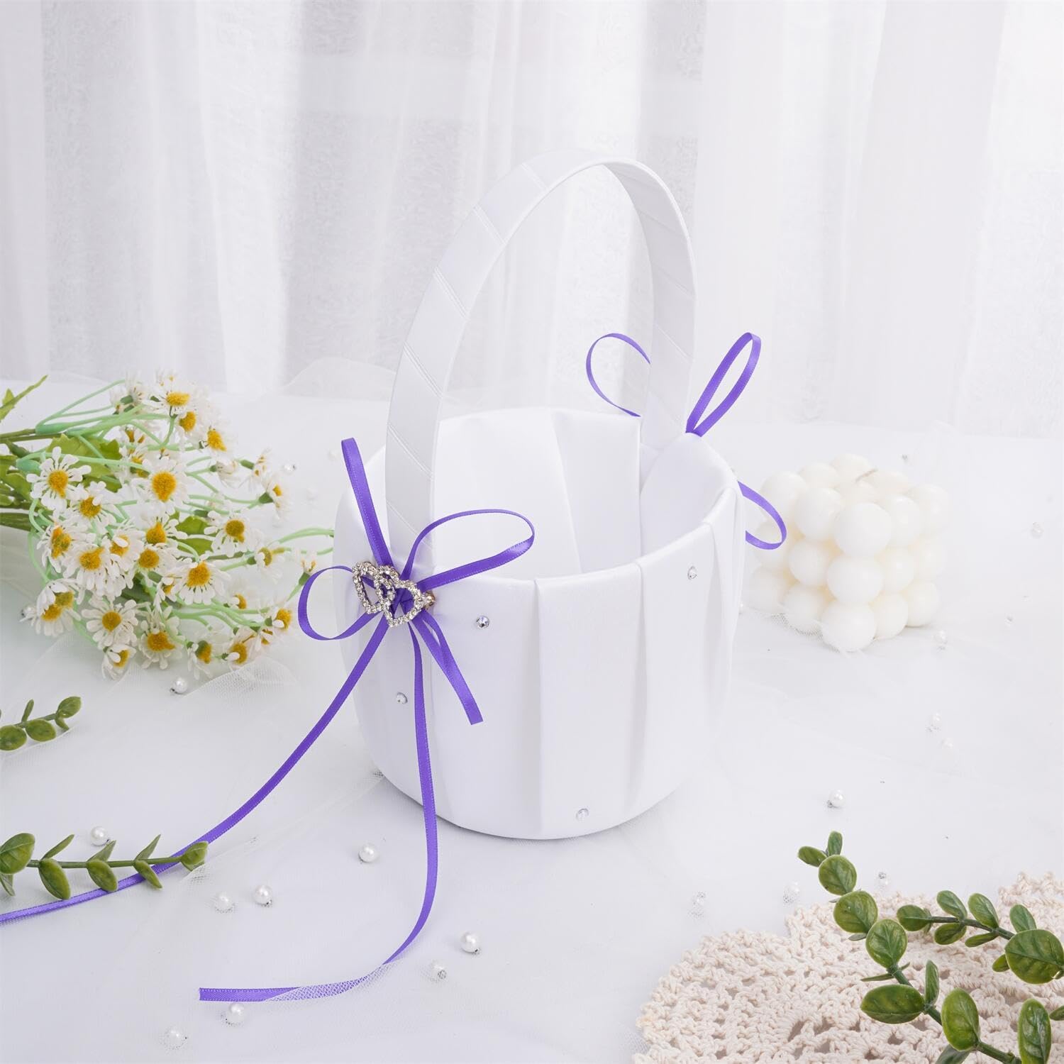 QIRMIZI Wedding Ring Pillow and Flower Girl Basket Set – Adorned with Pearl Rhinestones, White Satin,Purple