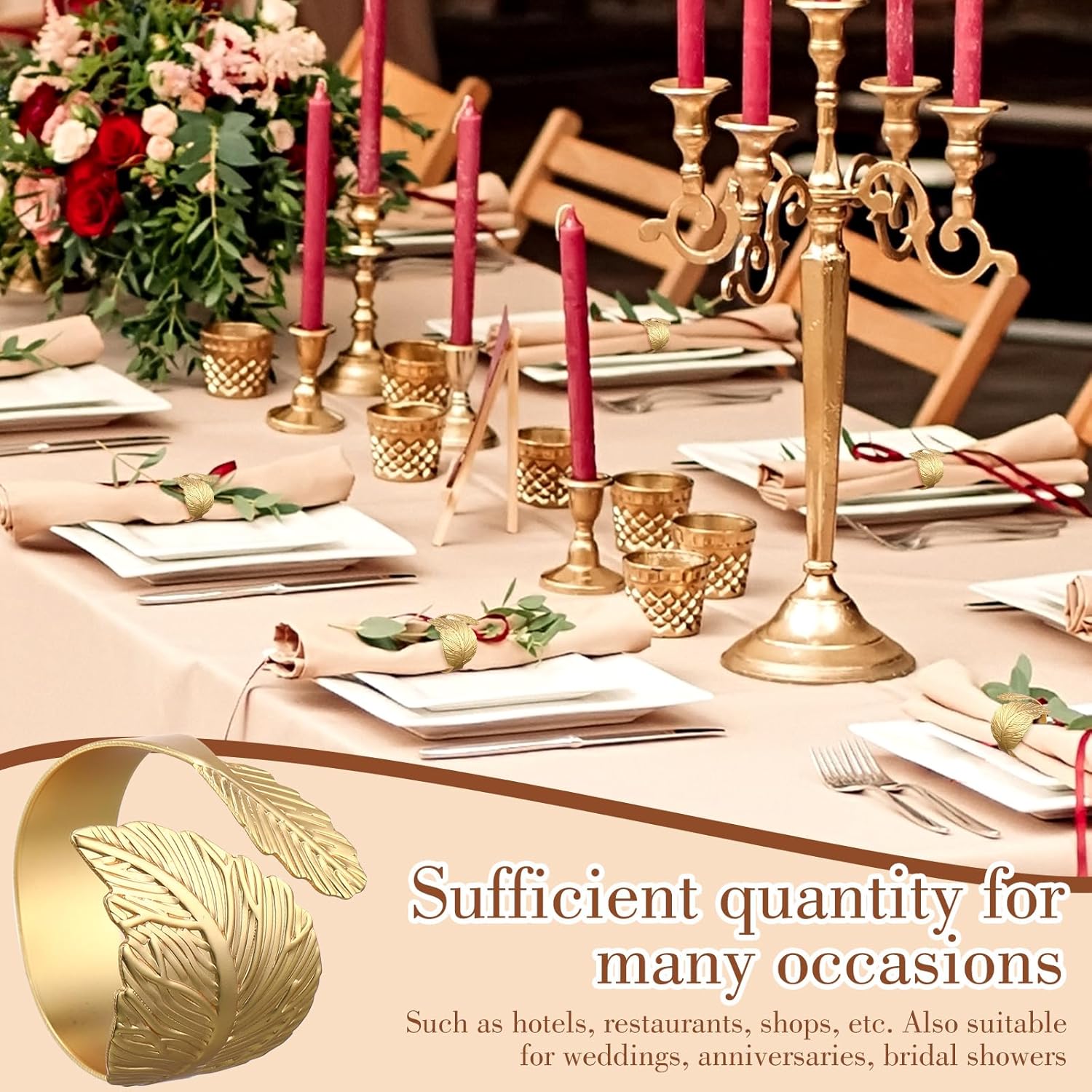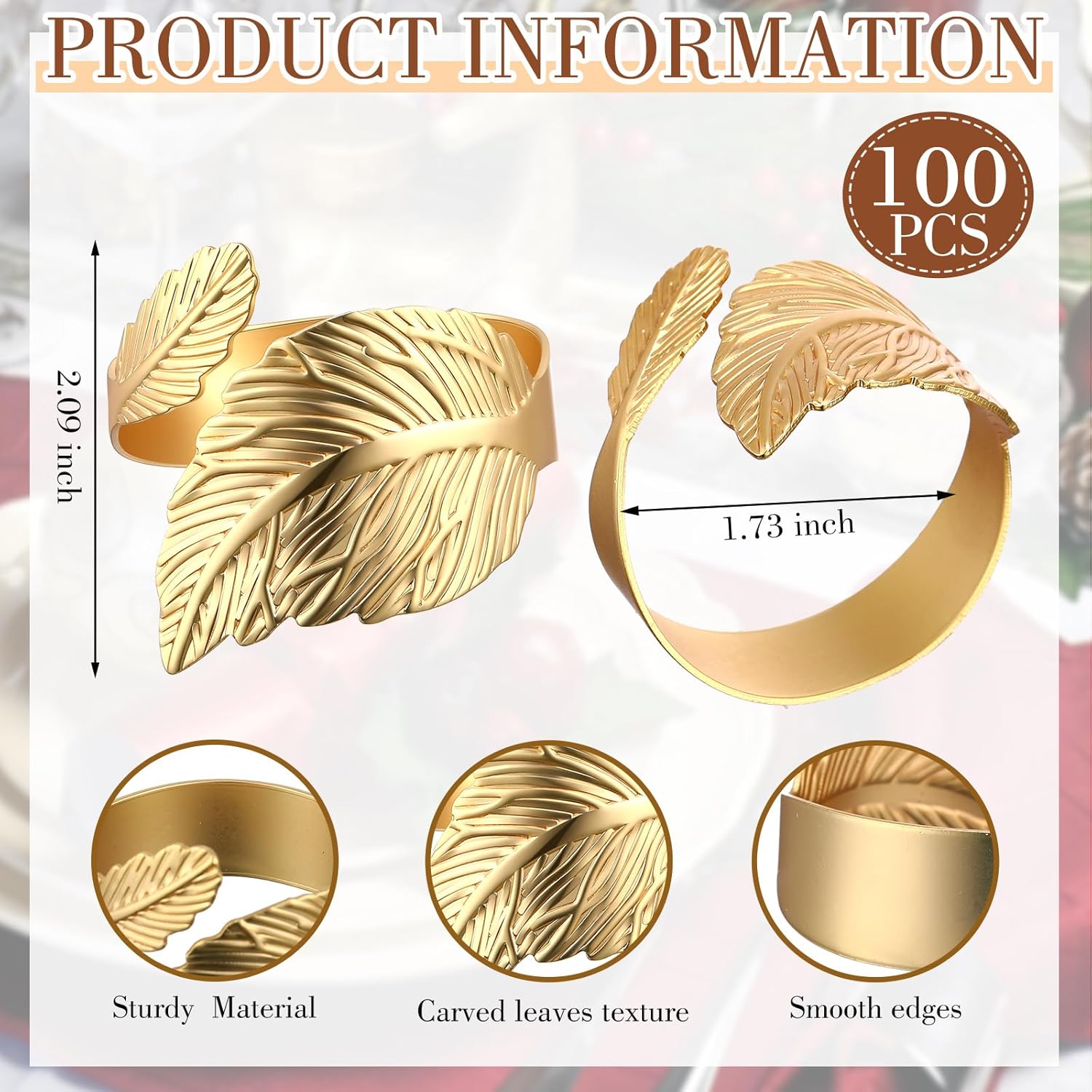 Bokon 100 Pcs Gold Napkin Rings for Wedding Shiny Metal Napkin Holder Study Leaf Shaped Table Decor for Dinner Parties Celebrations Receptions Thanksgiving Easter Christmas