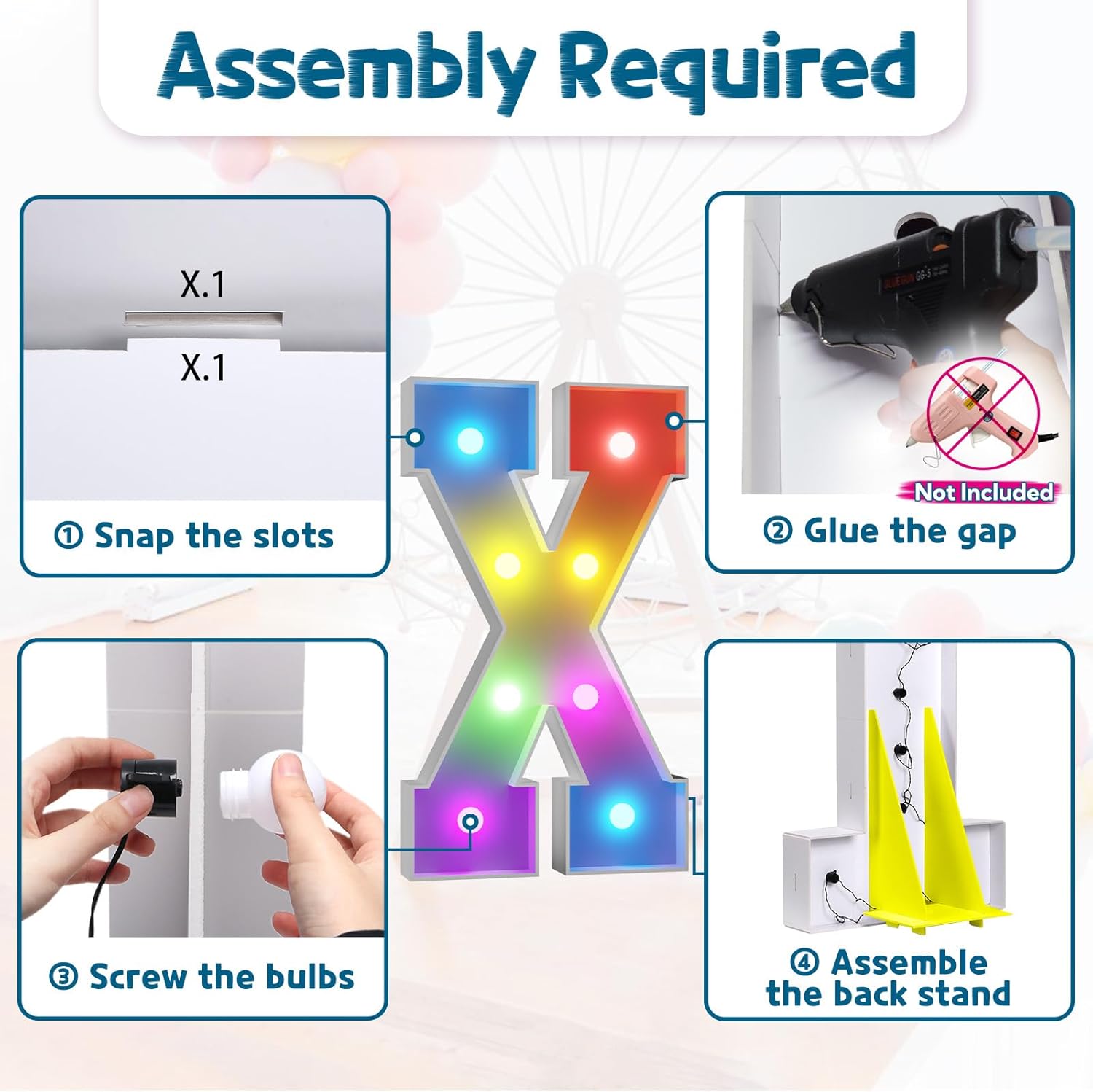 - Assembly Required. To assemble the light up numbers and letters, a hot glue gun is necessary. We have conveniently pre-cut the numbers into several pieces for your convenience. Simply consult the included instruction manual to easily assemble the impressive 4 ft tall and 3ft tall marquee numbers and letters using a hot glue gun.