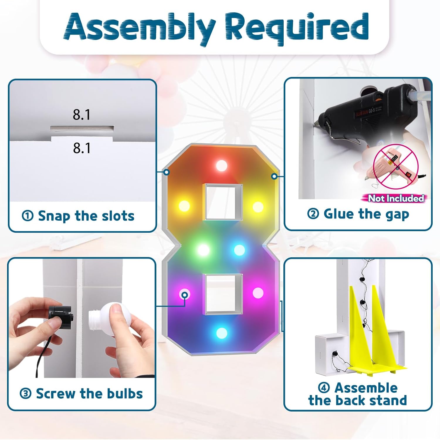 - Assembly Required. To assemble the light up numbers and letters, a hot glue gun is necessary. We have conveniently pre-cut the numbers into several pieces for your convenience. Simply consult the included instruction manual to easily assemble the impressive 4 ft tall and 3ft tall marquee numbers and letters using a hot glue gun.