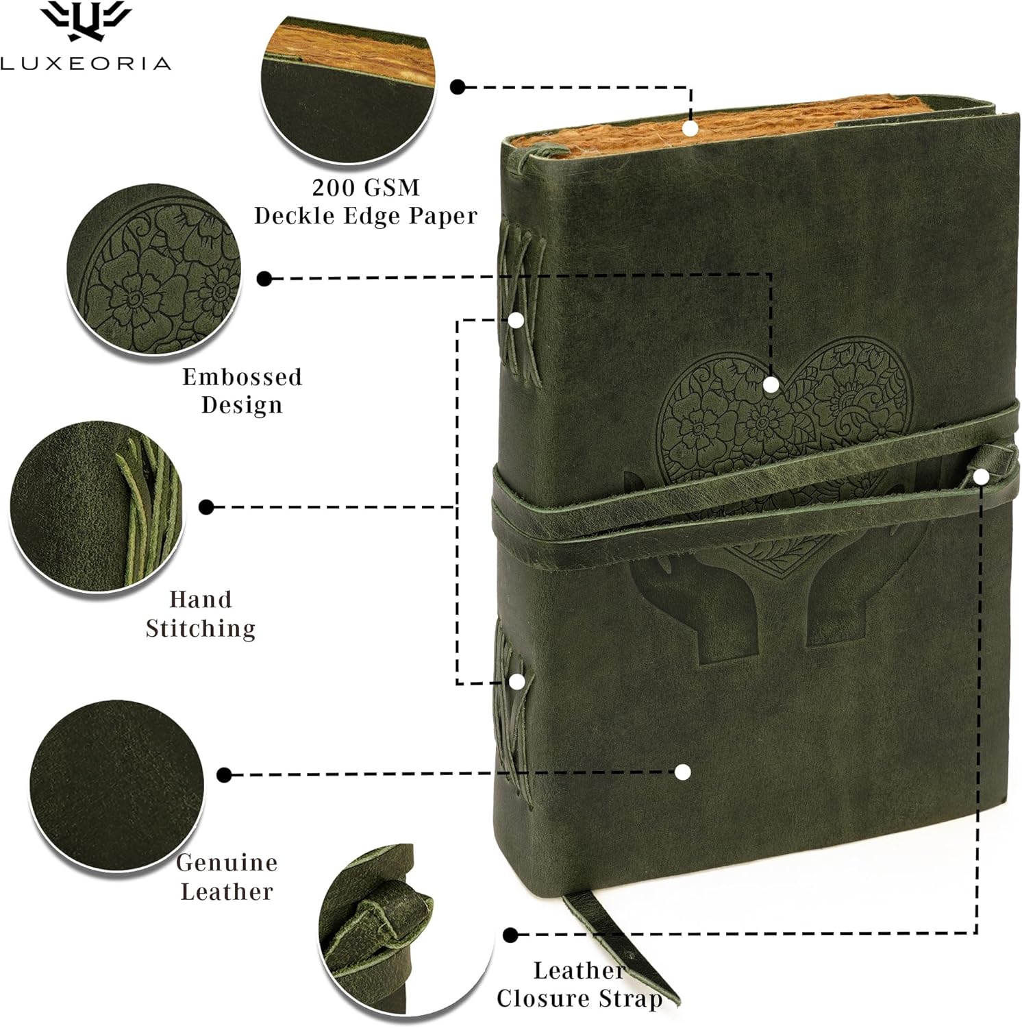 LUXEORIA Heart Journal for Women and Men, Handcrafted Leather Journal for Writing Womens, Sketchbook, Travel Diary with Unlined Deckle Paper, Dark Green 7x10