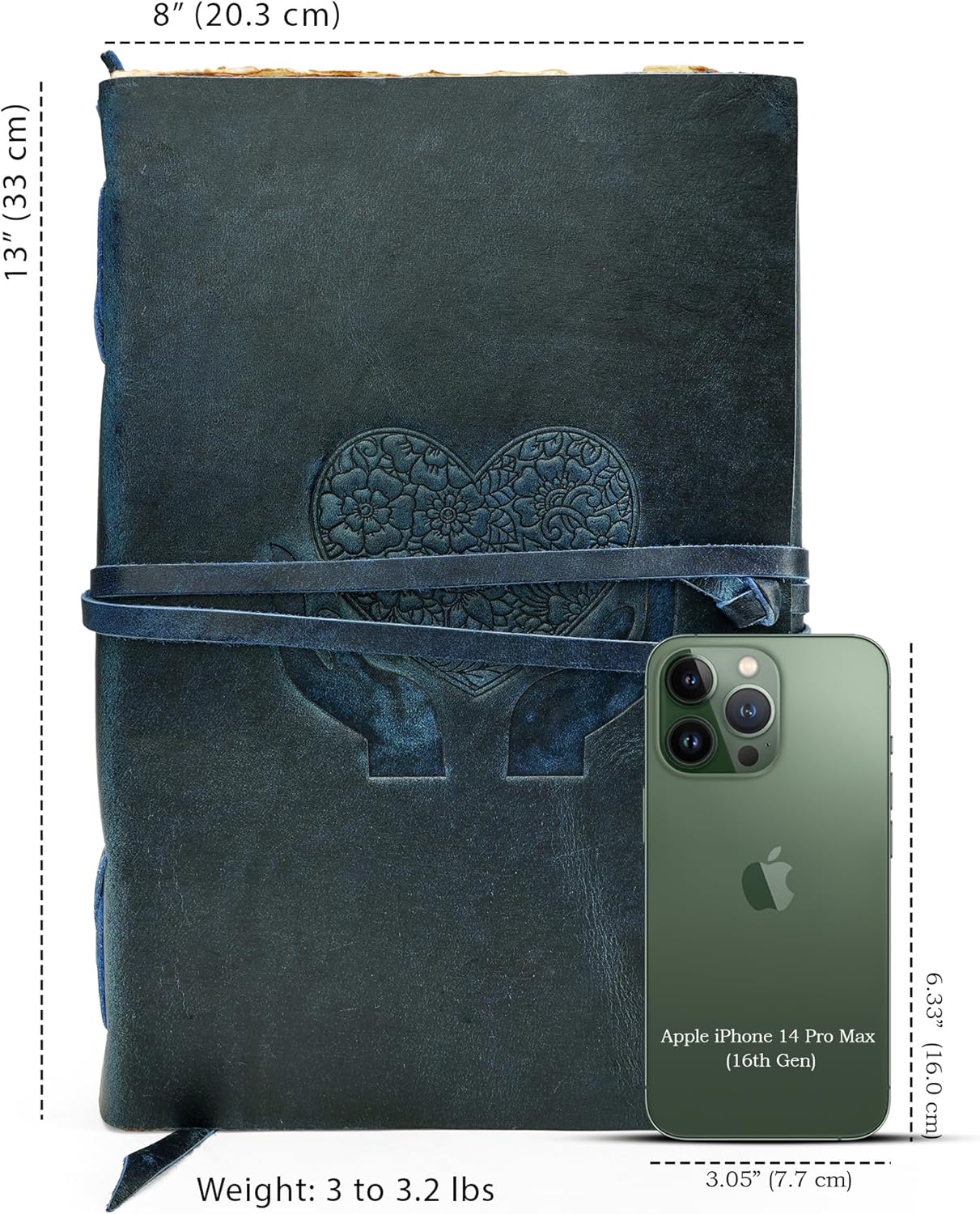 LUXEORIA Heart Journal for Women and Men, Handcrafted Leather Journal for Writing Womens, Sketchbook, Travel Diary with Unlined Deckle Paper, Dark Blue 8x13