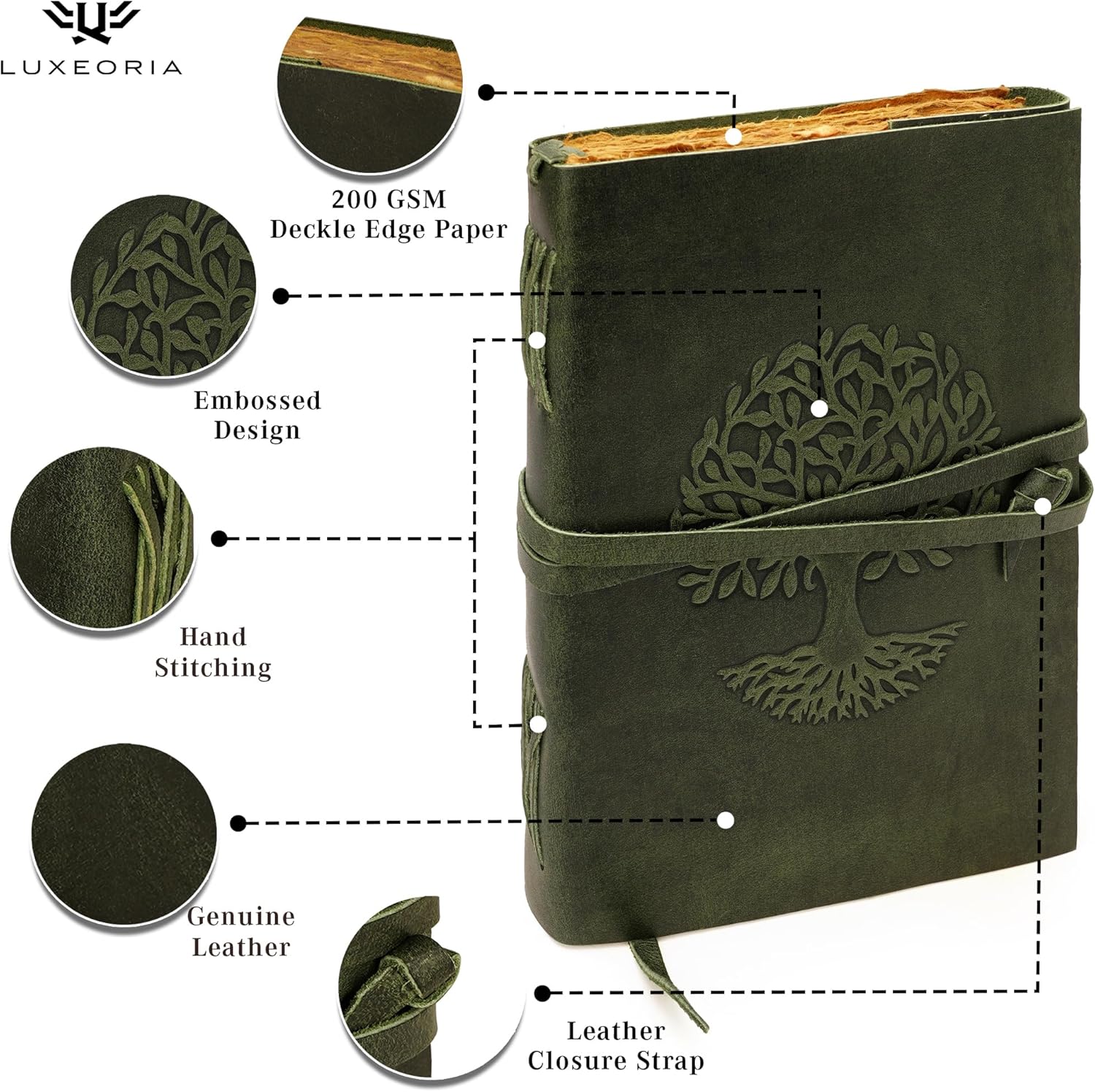 LUXEORIA Tree Of Life Leather Journal for Women and Men, Handcrafted Leather Journal for Writing Womens, Sketchbook, Travel Diary with Unlined Deckle Paper, Dark Green 7x10