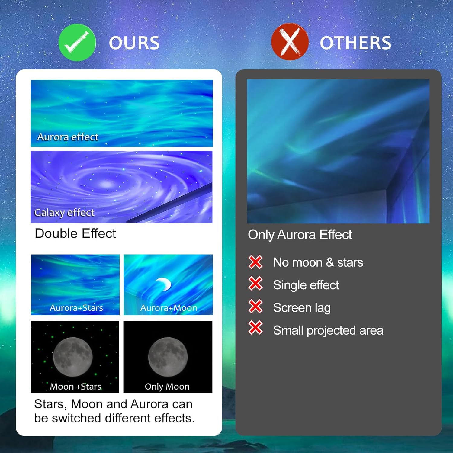 - NEW DUAL EFFECT DESIGN: Unlike other star projectors in the market, ELITUN Star Projector adopts a dual effect design, which can project both Northern Lights and Milky Way effects, and it can also be set up with the moon and twinkling stars. When you turn on the LED star projector, you can see the aurora borealis at one second, and then you feel like you are in the Milky Way at the next second.