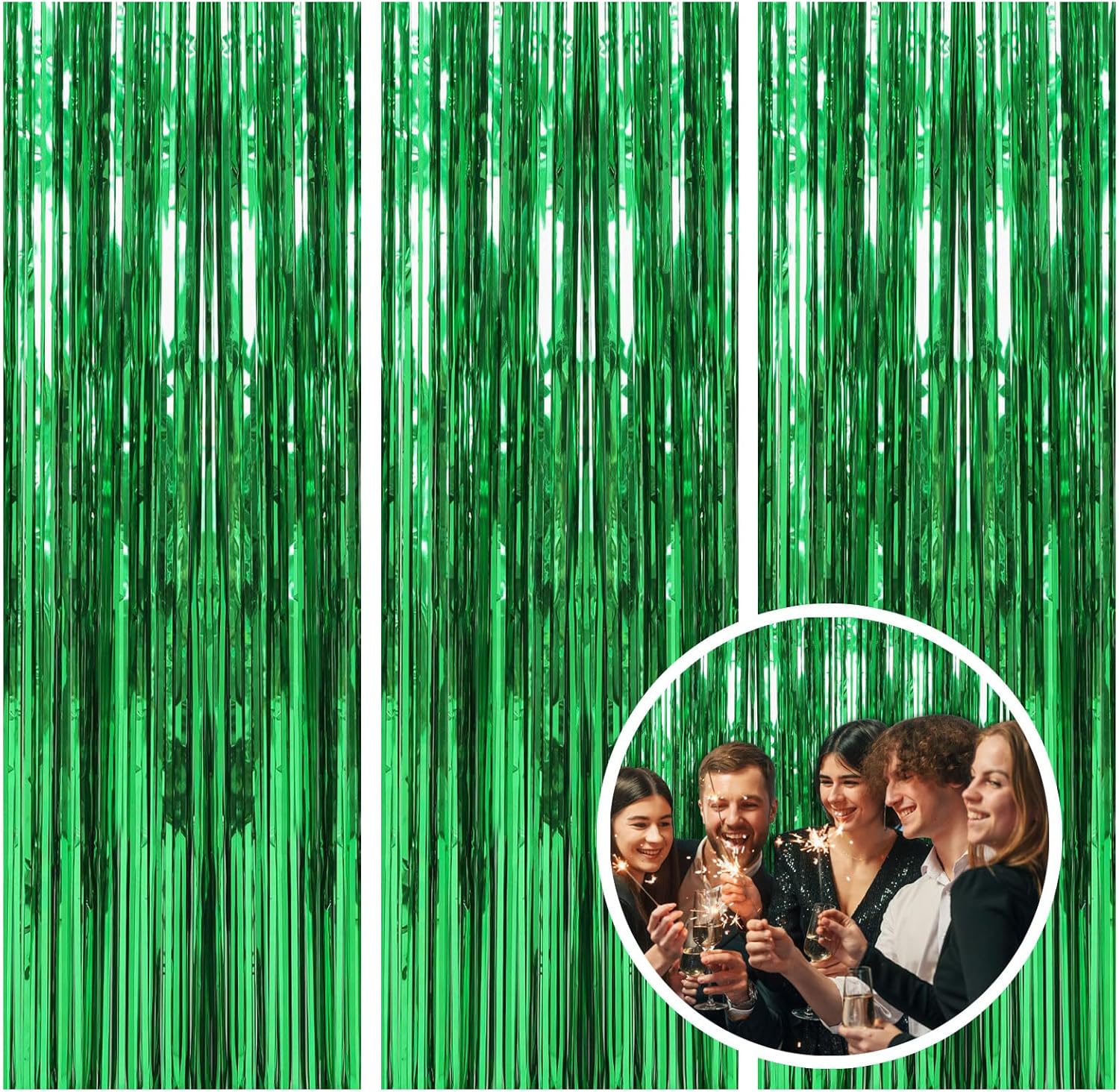 3 Pack Green Backdrop Tinsel Curtain Party Streamers Jungle Party Decorations Foil Fringe Green Backdrop for Birthday Christmas Dinosaur Animal St Patrick's Day Football Party Decorations